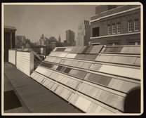 General view of exposure racks designed to test the weathering capabilities of varnishes and other products manufactured by the Rohm and Haas Company. The racks are positioned on the roof of the company's home office…