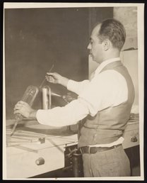 General view of a glassblower, identified as L. Testa, working in an unidentified U.S. Department of Agriculture facility. Per a 1931 list of technical workers in the Department of Agriculture, Testa worked as a…