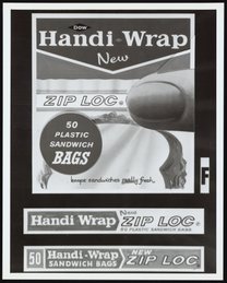 General view of an artist's rendering of packaging for Dow Handi-Wrap sandwich bags. Introduced in the 1960's, Dow Handi-Wrap was an economy plastic wrap specifically marketed for use in lunchboxes and for its ability…
