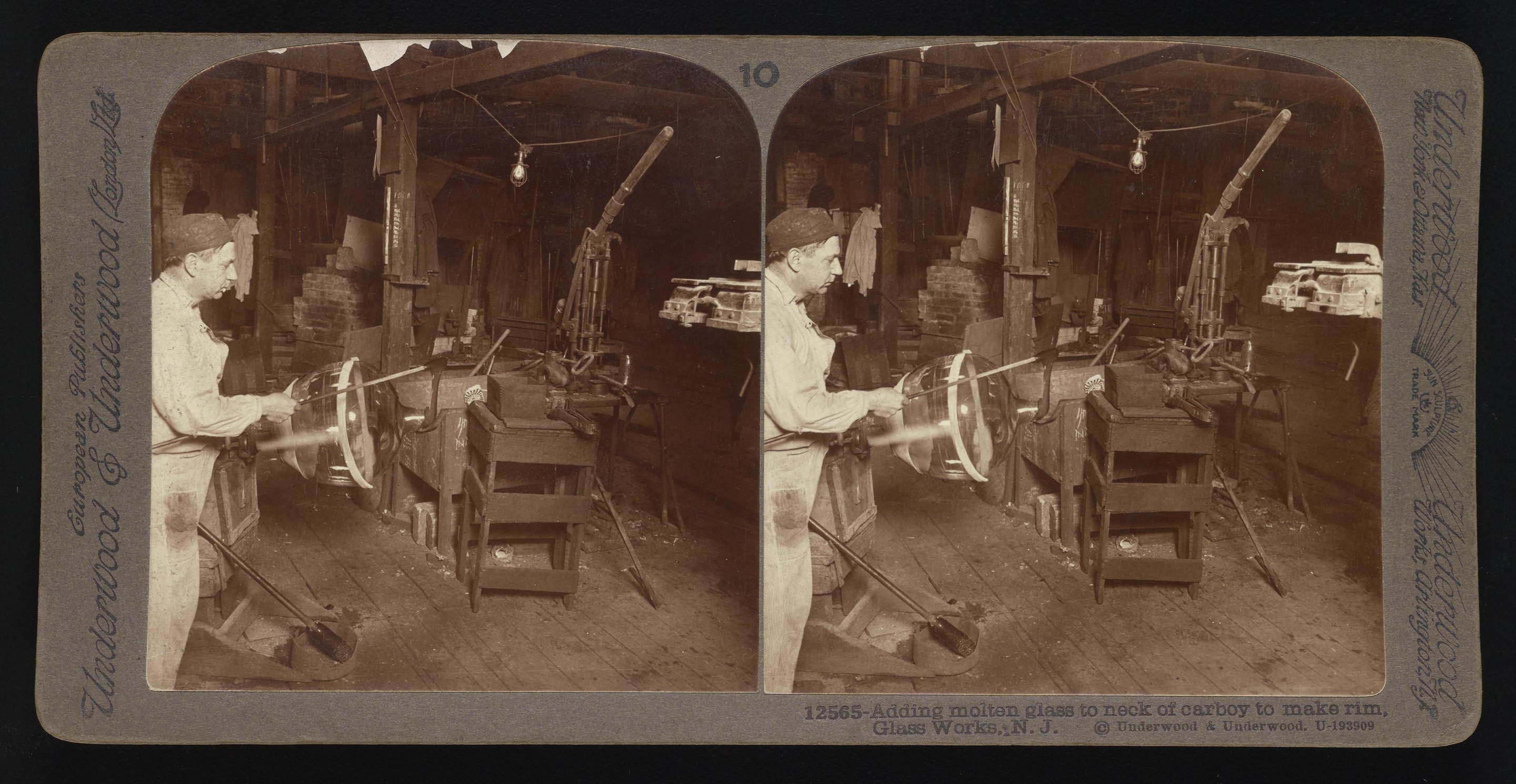 “Adding Molten Glass to Neck of Carboy to Make Rim.” Underwood & Underwood, n.d. Underwood & Underwood Stereographs of Manufacturing Industries. Science History Institute. Philadelphia. https://digital.sciencehistory.org/works/000000018.