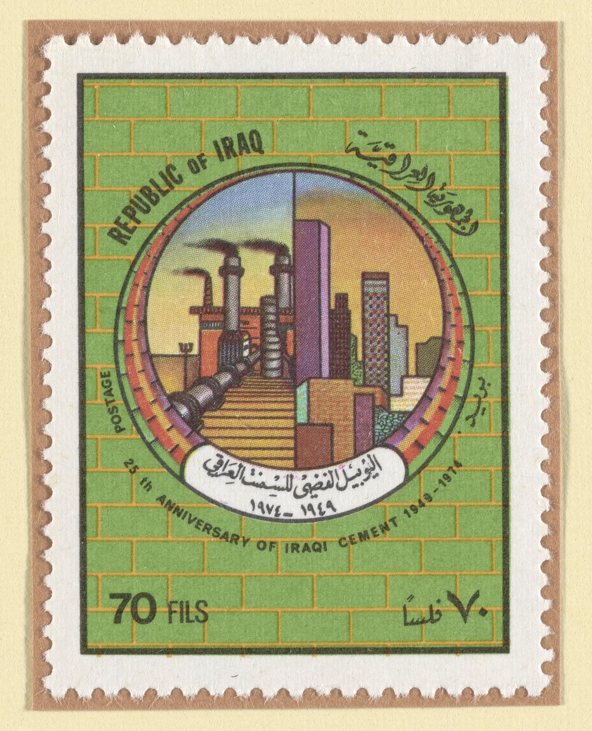 Postage stamp commemorating the 25th anniversary of the Iraqi cement industry