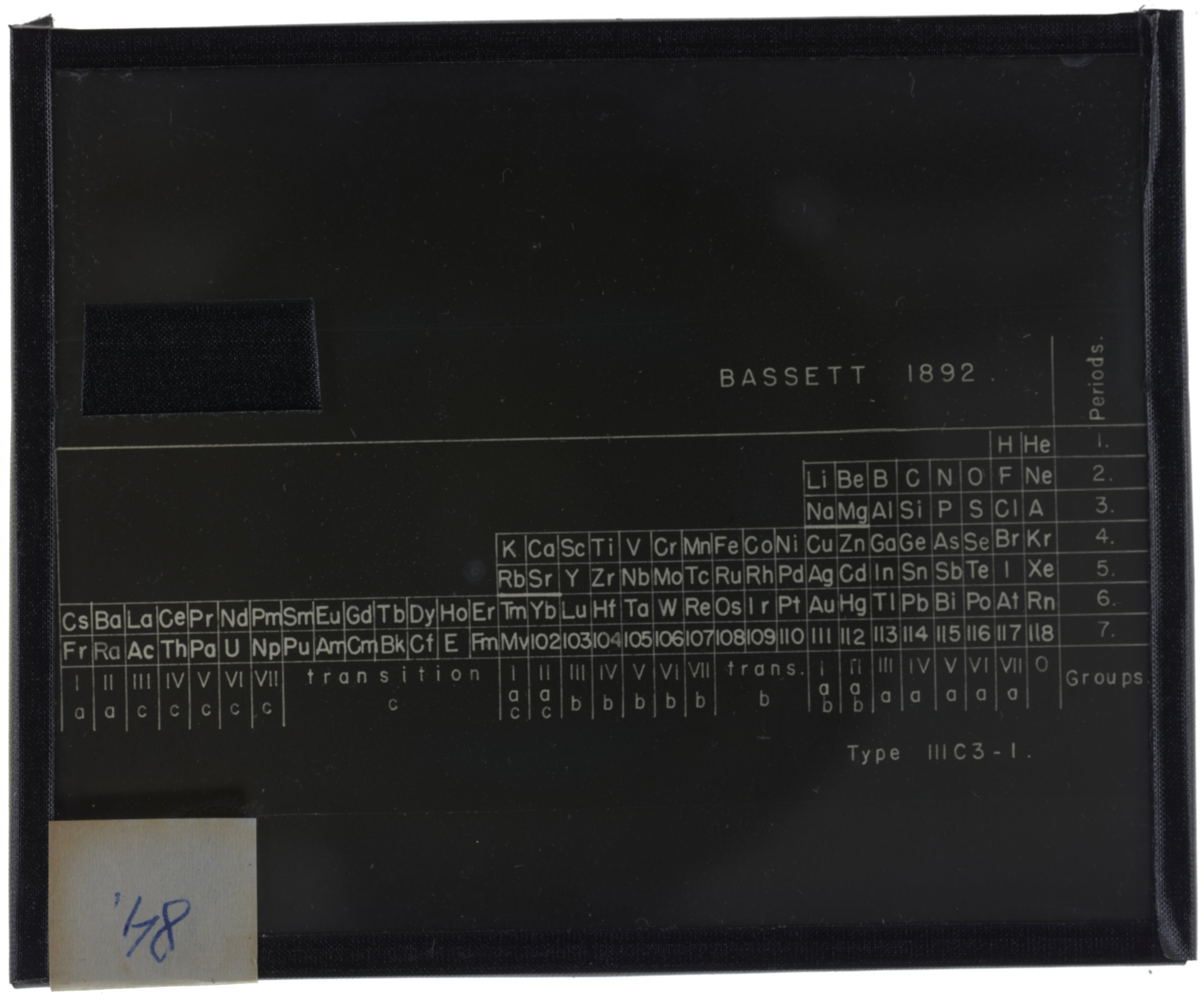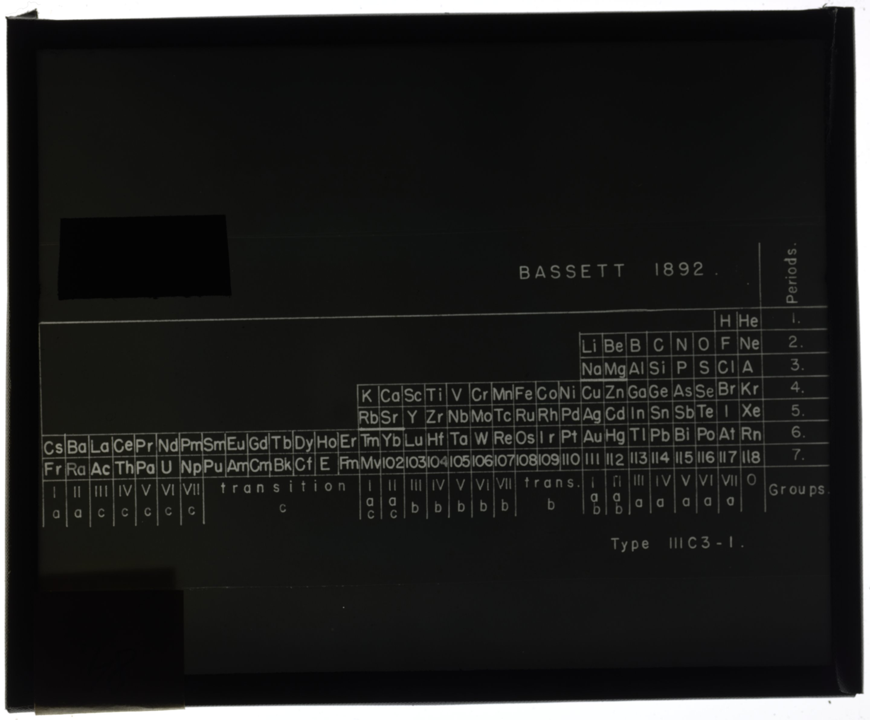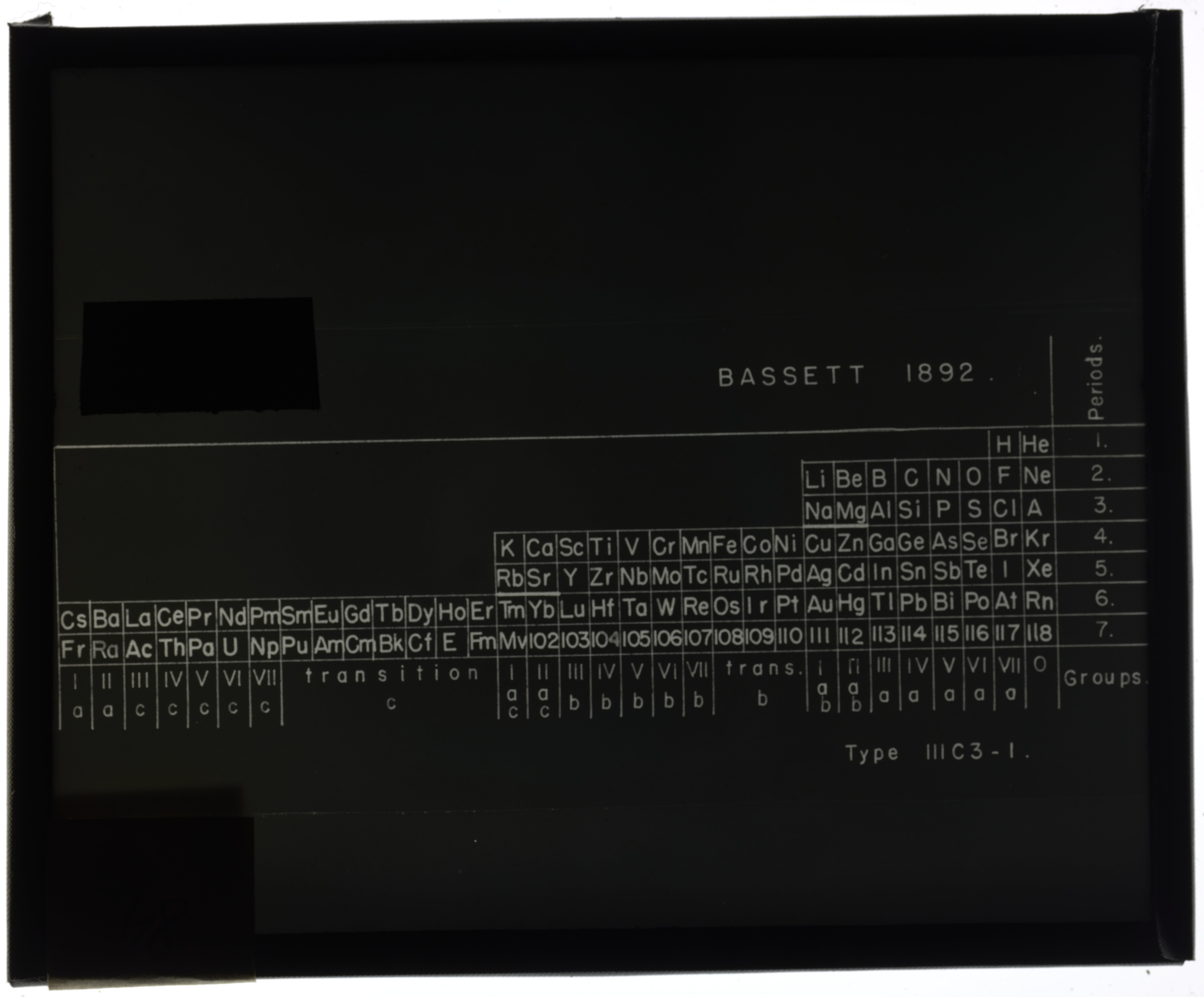 Bassett, Henry, and Edward G. Mazurs. “Left-Step Table with Group 0 on Right-Hand Side.” Glass (material), circa 1892–1957. Edward G. Mazurs Collection of Periodic Systems Images, Box 1. Science History Institute. Philadelphia. https://digital.sciencehistory.org/works/02870w51s.
