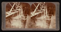 View of two workers constructing sand molds for pig iron, an intermediate product of smelting iron ore produced from a blast furnace, at an unknown manufacturing plant. Used to form pig iron ingots, such molds are traditionally formed in sand and feature a branching structure meant to resemble a litter of piglets being suckled by a sow. This photograph is one of a set of fourteen stereographs detailing the production of iron and steel by various processes.