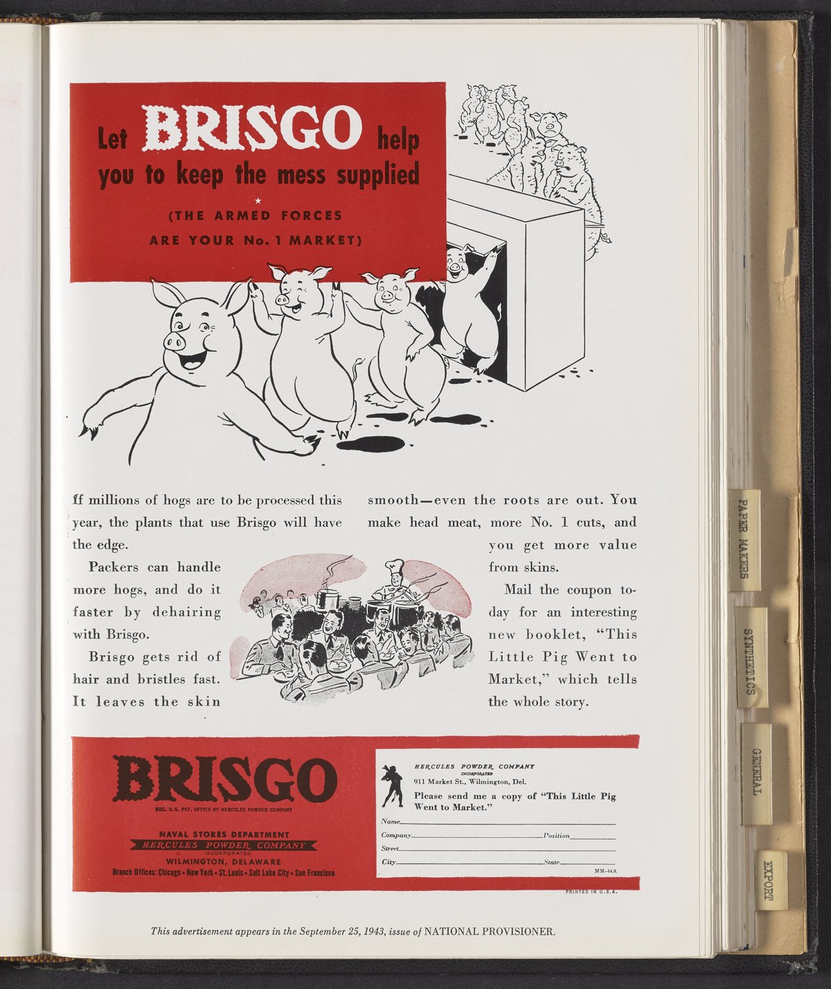 Hercules Incorporated. “Let Brisgo Help You to Keep the Mess Supplied.” 1943 Hercules Advertisements, 1943. Records of Hercules Incorporated, Volume 1943. Science History Institute. Philadelphia. https://digital.sciencehistory.org/works/08612p411.