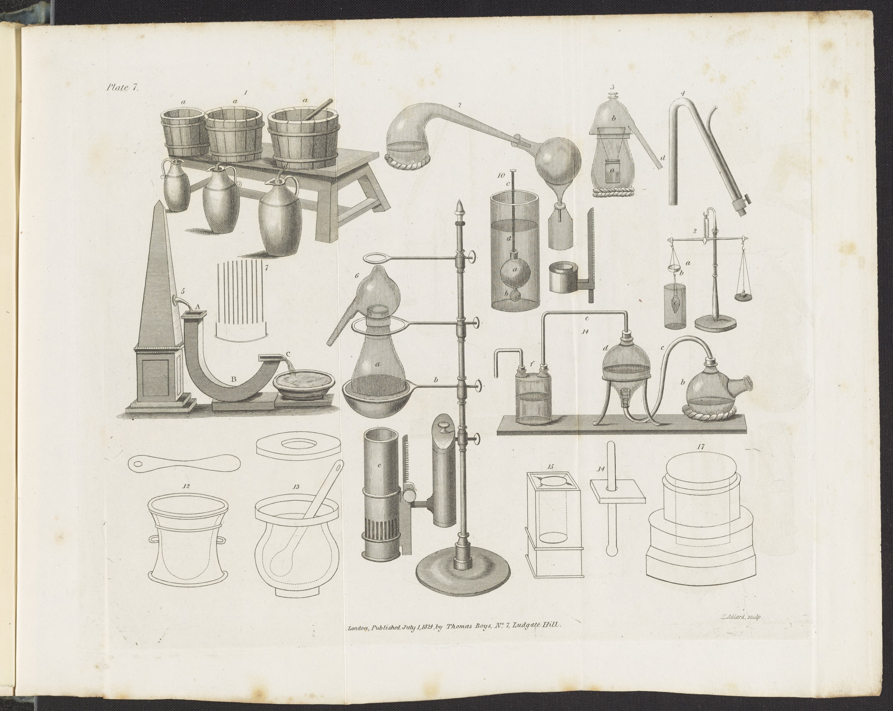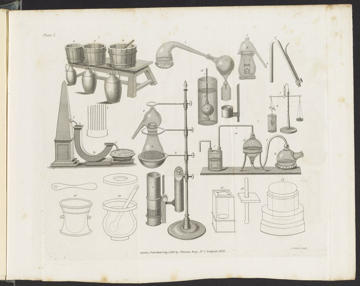 Accum, Friedrich Christian. “Plate 7: Lixiviating Tubs; Filtration Fountain; Chemical Lamp Furnace; Distillatory Apparatus; Mortars.” In An Explanatory Dictionary of the Apparatus and Instruments Employed in the Various Operations of Philosophical and Experimental Chemistry. London, England: Thomas Shotter Boys, 1824. https://digital.sciencehistory.org/works/0c483j41b.