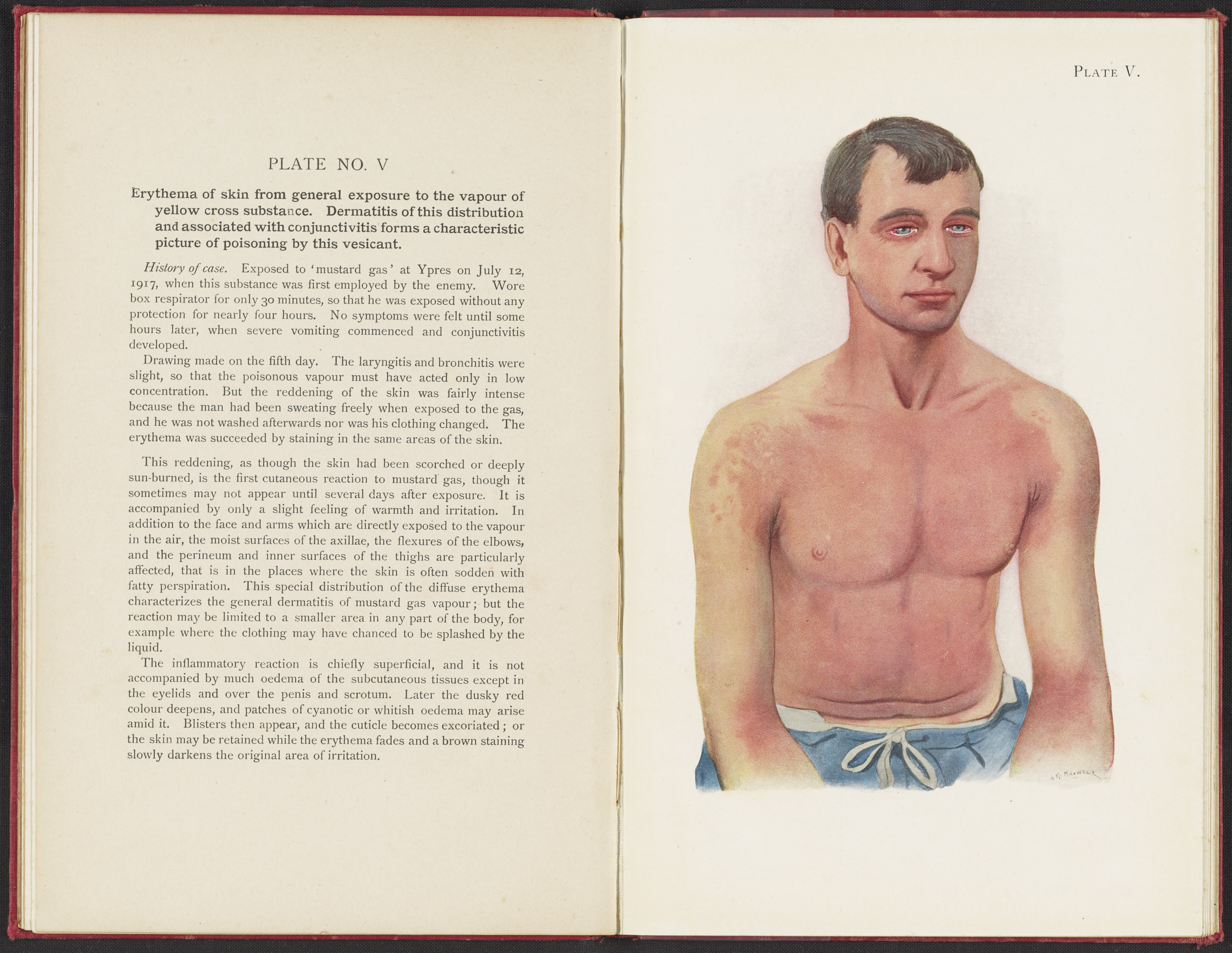 Great Britain. Medical Research Committee. “Plate V. Erythema of Skin from General Exposure to the Vapour of Yellow Cross Substance.” An Atlas of Gas Poisoning. London, England, 1918. https://digital.sciencehistory.org/works/0c483j42m.