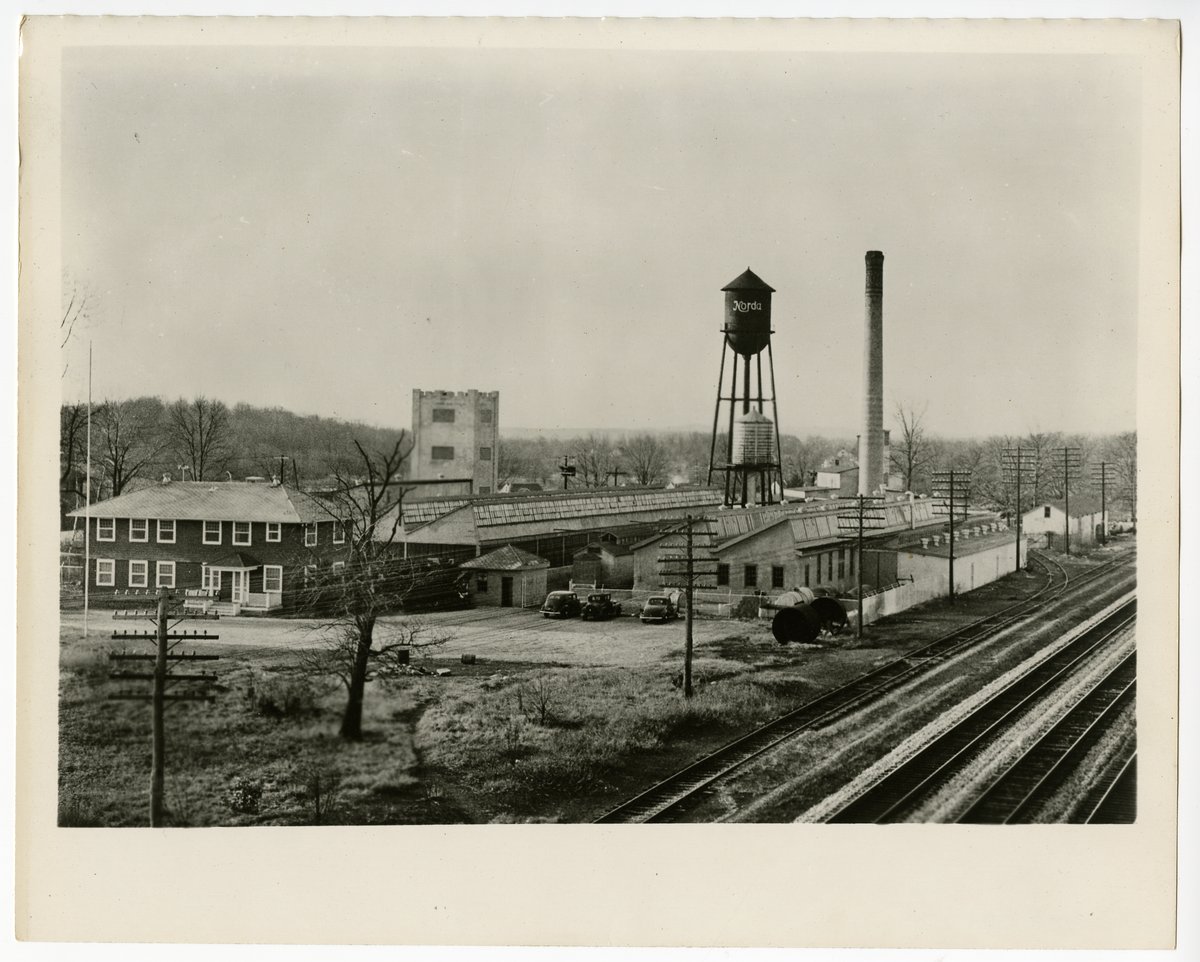 Exterior view of the Norda Company plant in Boonton, New Jersey. Photograph includes view of smokestack and water tower branded with "Norda," as well as neighboring railroad tracks.