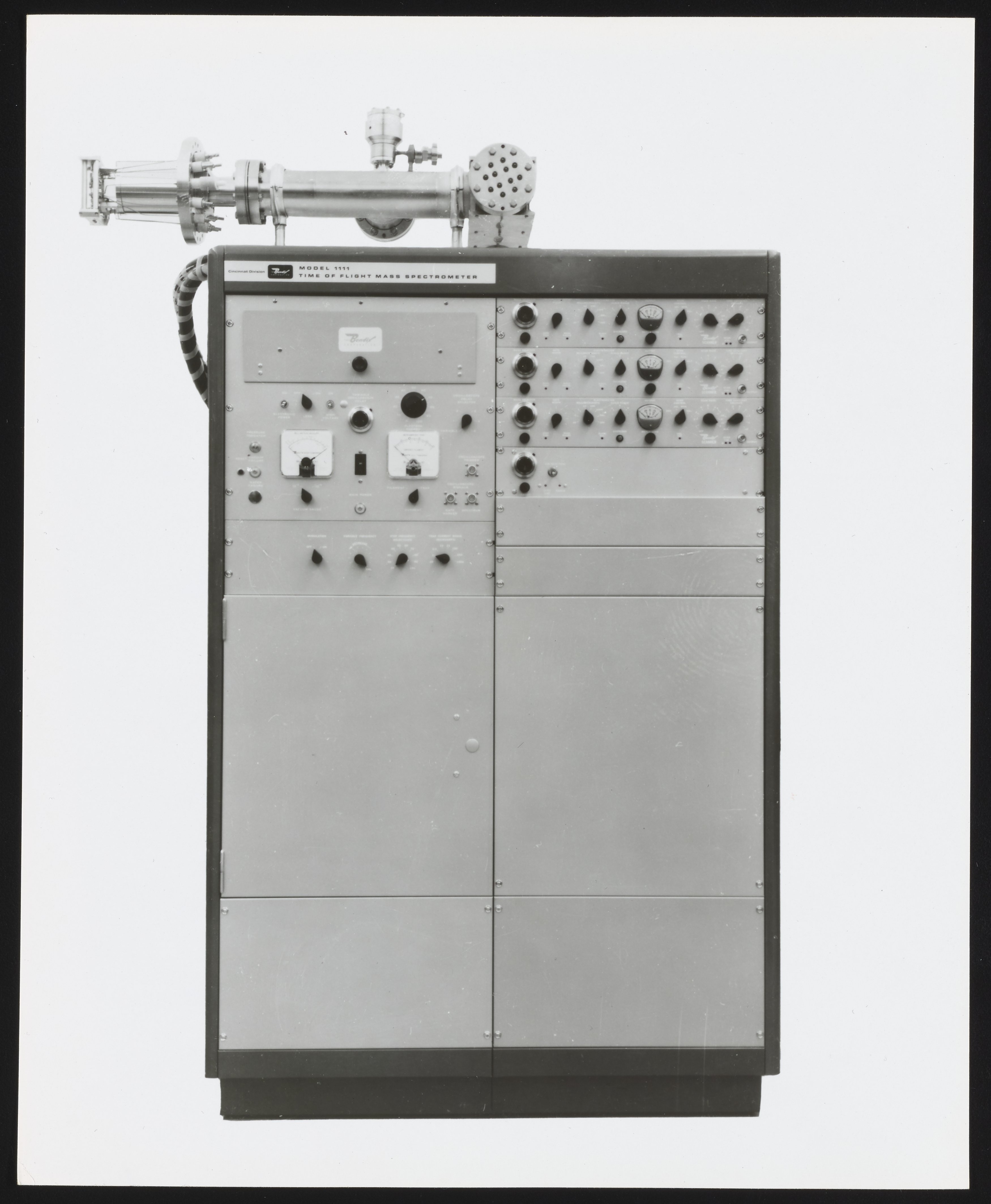 General view of a Bendix Model 1111 Time-of-Flight Mass Spectrometer, with view of the ion source and assorted control panels. The Time-of-Flight Mass Spectrometer (TOFMS) was the flagship analytical instrument of the Bendix Corporation.