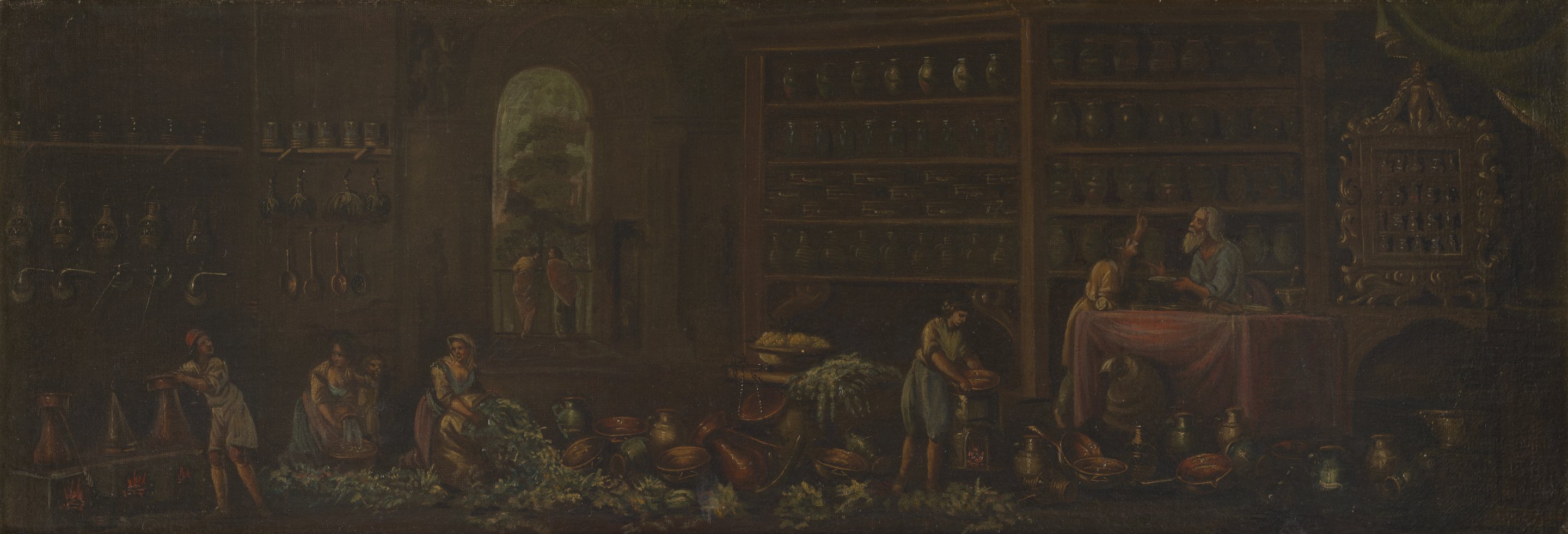 The walls of this busy and productive apothecary's shop are lined with glass vessels and earthenware jars used for the preparation and storage of drugs, tonics and purgatives. The apothecary sits at his desk, conversing with a young assistant in front of a cabinet of "simples" or prepared medicines. On the floor at left, women kneel to pick and sift through bundled herbs and plants. A row of distillation vessels sit above a fire at left, tended by a boy in a cap and apron. Through the large vaulted door, two women can be seen conversing in front of a landscape of trees.