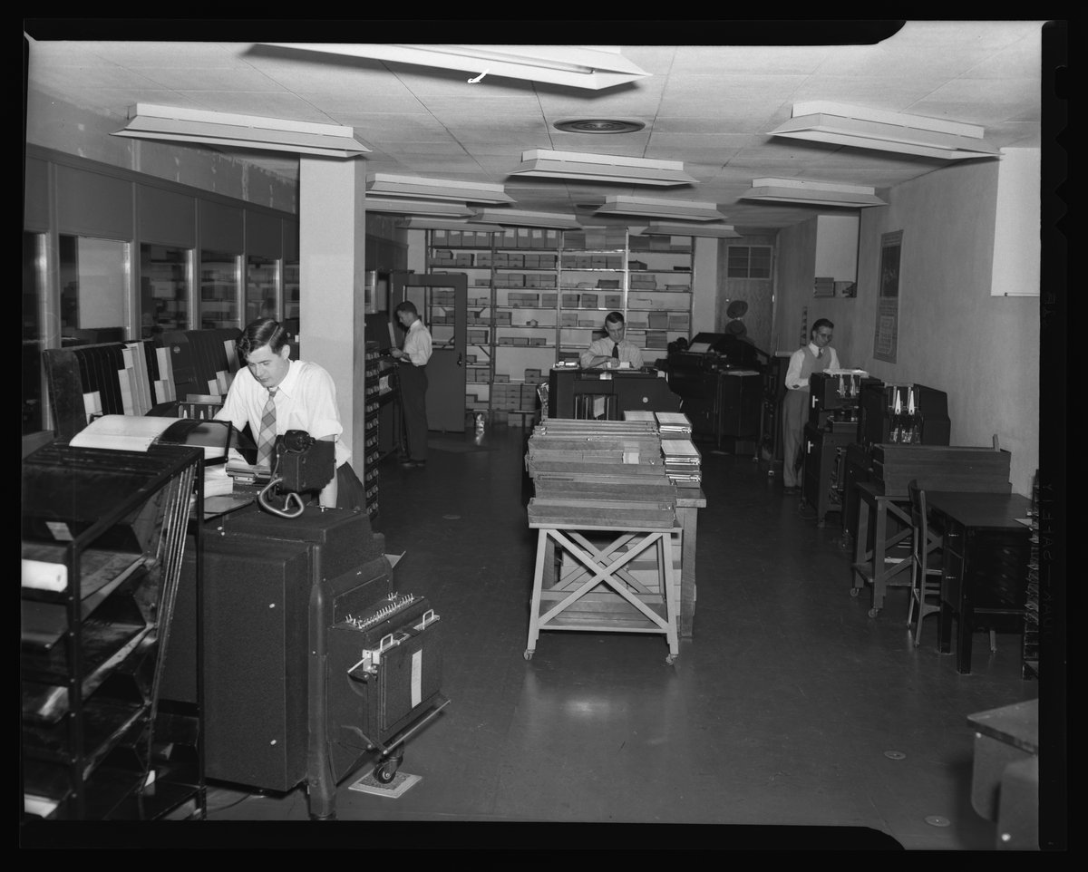 General view of unidentified employees at work in the machine tabulating room at the Dow Chemical Company facilities located in Midland, Michigan. Per an article in the December 16, 1947 edition of The Brine Well, the Tabulating Department leased fifty-two machines from IBM to automatically transcribe, reproduce, and calculate data for a range of uses, including inventory control, material distribution, personnel records and statistics, payroll, sales analysis, and product usage.