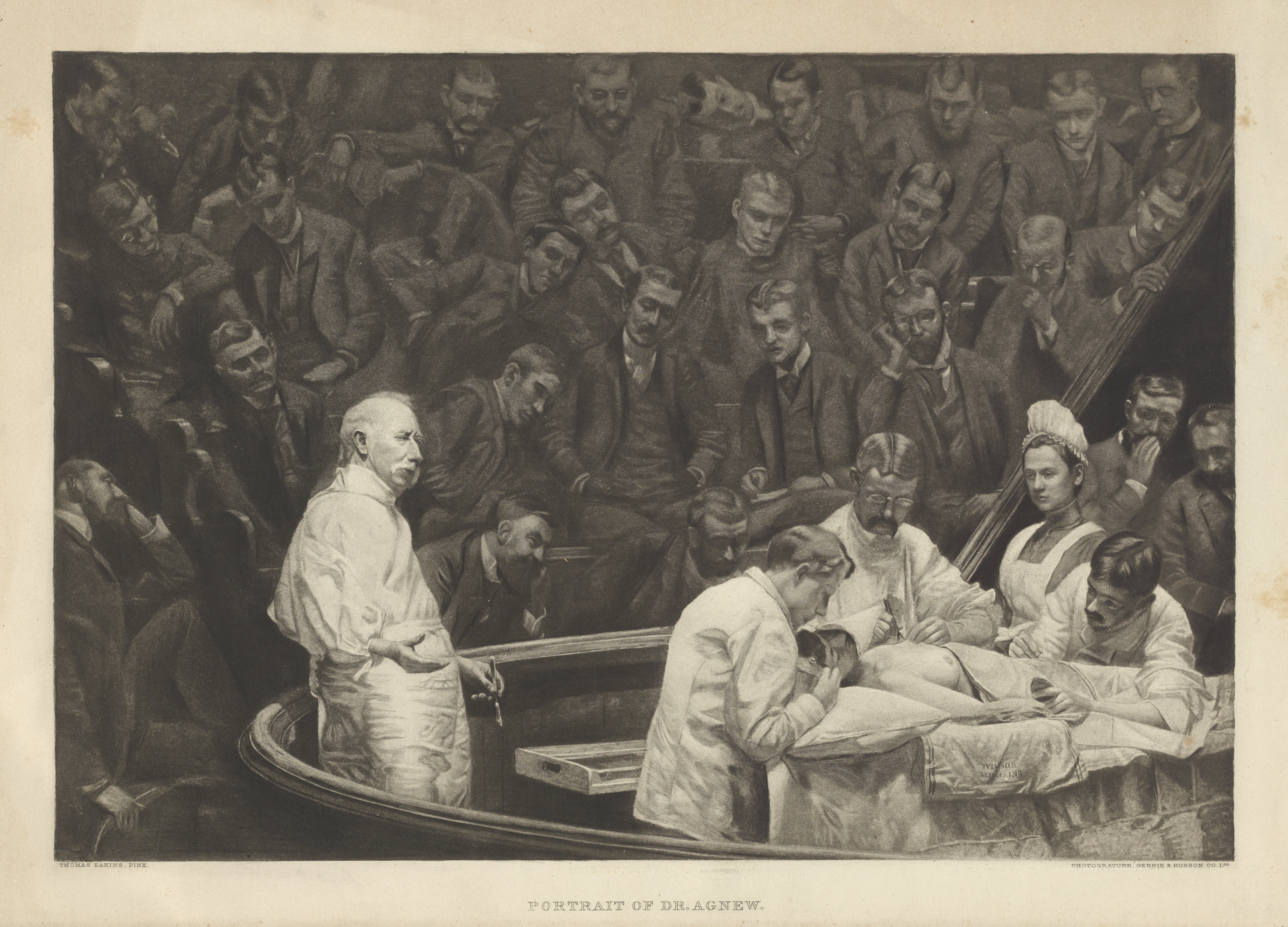 This photogravure by Gebbie & Husson Co. Ltd. reproduces Thomas Eakins' painting known as The Agnew Clinic (or The Clinic of Dr. Agnew). Eakins was commissioned by the University of Pennsylvania Medical Class of 1889 to paint a portrait of Dr. David Hayes Agnew (1818-1892), who was retiring as professor that year. Dr. Agnew is depicted lecturing during a partial mastectomy before an audience of medical students, being assisted by Penn professors Dr. J. William White (1850-1916) and Dr. Joseph Leidy (the nephew of famed professor Joseph Leidy) and by Hospital of the University of Pennsylvania physician Dr. Ellwood R. Kirby. The work also includes nurse Mary Clymer (who was an 1889 graduate of the Hospital of the University of Pennsylvania), and behind her on the far right, another HUP physician, Frederick H. Milliken, is in conversation with Eakins himself.