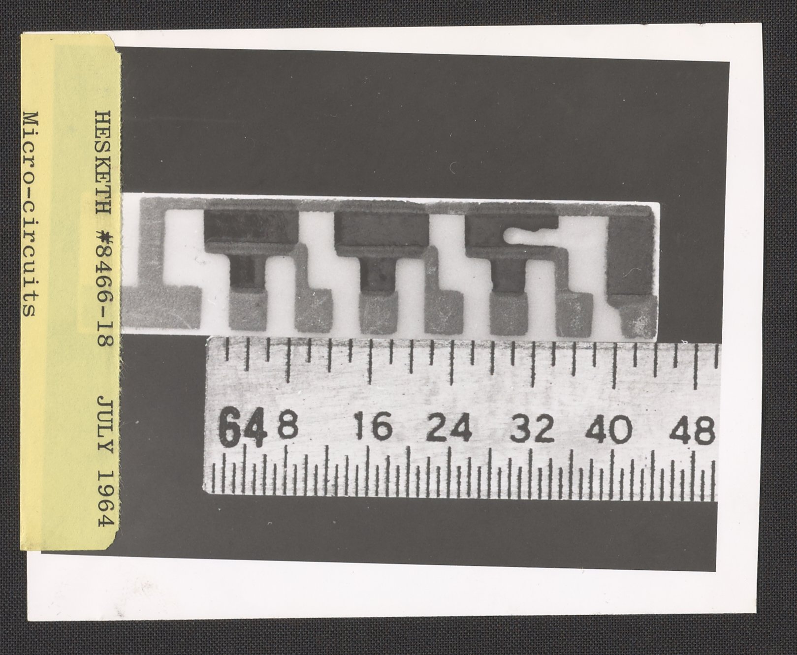 Hesketh, Dean D. “Helipot Custom Microcircuit with a Ruler,” July 1964. Beckman Historical Collection, Box 85. Science History Institute. Philadelphia. https://digital.sciencehistory.org/works/0r967411t.