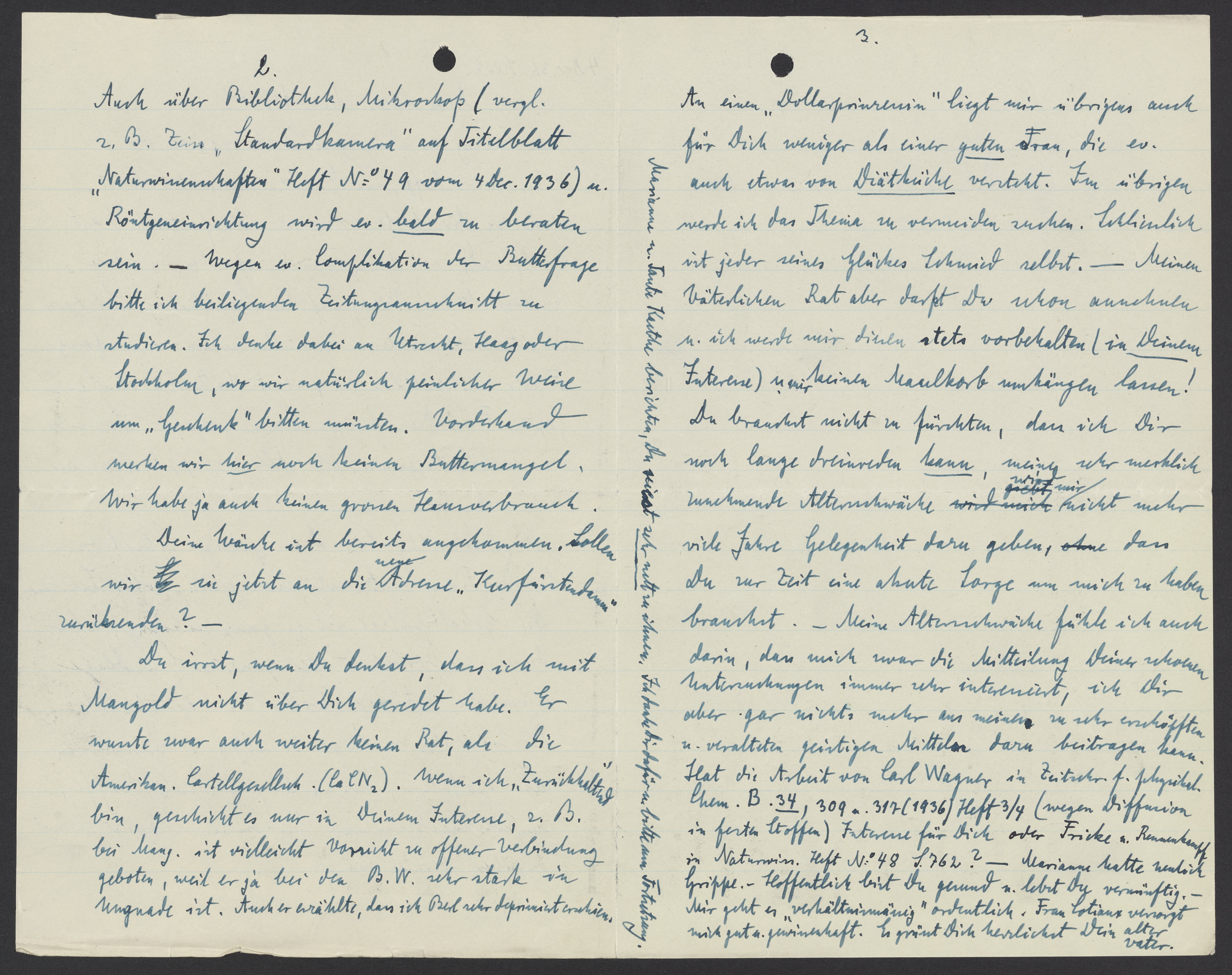 Auch über Bibliothek, Mikroskop (vergl. z.B. Zeis „Standardkamera“ auf Titelblatt „Naturwissenschaften“ Heft No 49 vom 4 Dec. 1936) u. Röntgeneinrichtung wird ev. bald zu beraten sein. – Wegen ev. Complikation der Butterfrage bitte ich beiliegenden Zeitungsauschnitt zu studieren. Ich denke dabei an Utrecht, Haag oder Stockholm, wo wir natuerlich peinlicher Weise um „Geschenke“ bitten müssten. Vorderhand merken wir hier noch keinen Buttermangel. Wir haben ja auch keinen grossen Hausverbrauch.