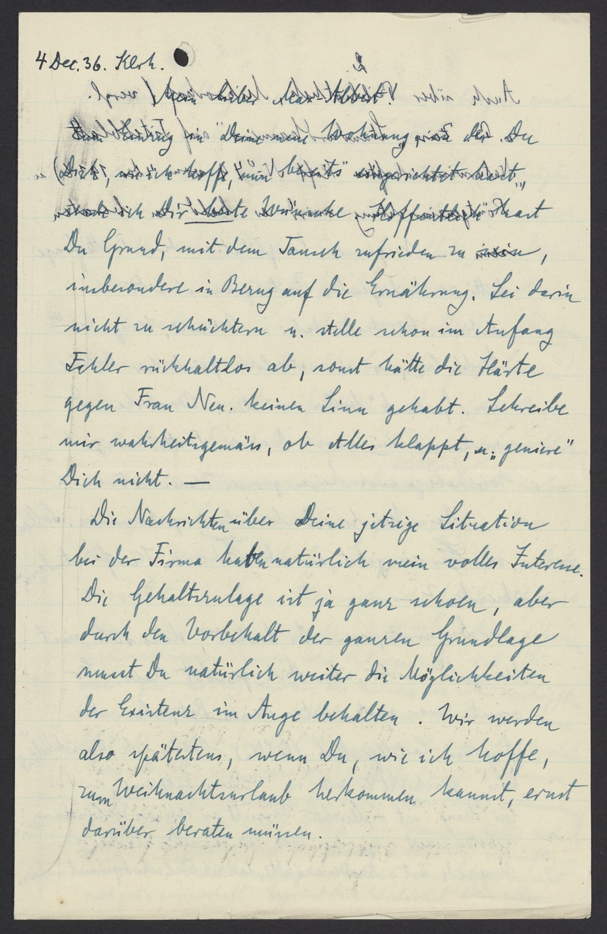 Die Nachrichten über Deine jetzige Sitation bei der Firma haben natürlich mein volles Interesse. Die Gehaltszulage ist ja ganz schön, aber durch den Vorbehalt der ganzen Grundlage musst Du natürlich weiter die Möglichkeiten der Existenz im Auge behalten. Wir werden also spätestens, wenn Du, wie ich hoffe, zum Weihnachtsurlaub herkommen kannst, erst darüber beraten müssen.