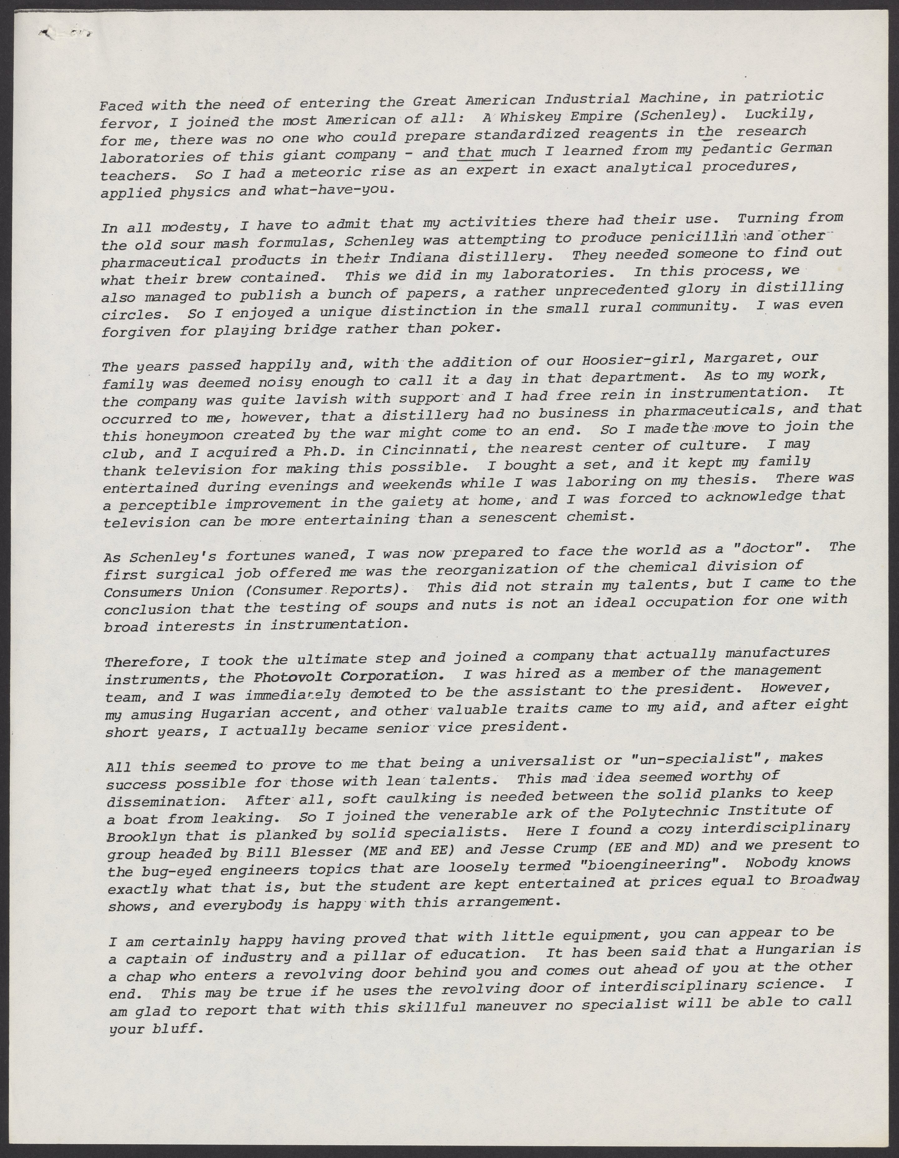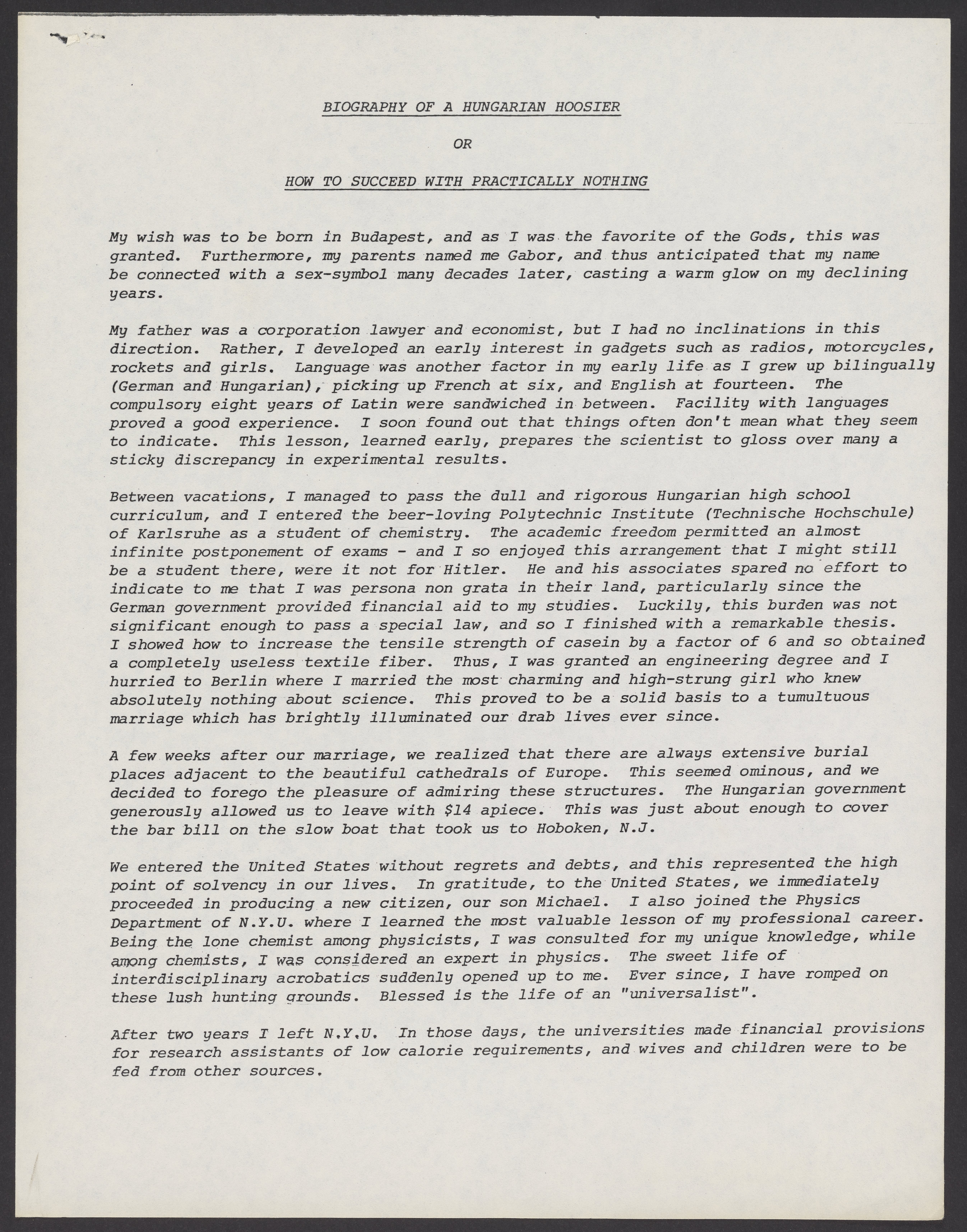 Levy, Gabor B. “Biography of a Hungarian Hoosier, or, How to Succeed With Practically Nothing,” circa 1980. Papers of Gabor B. Levy, Box 1, Folder 2. Science History Institute. Philadelphia. https://digital.sciencehistory.org/works/10veii8.