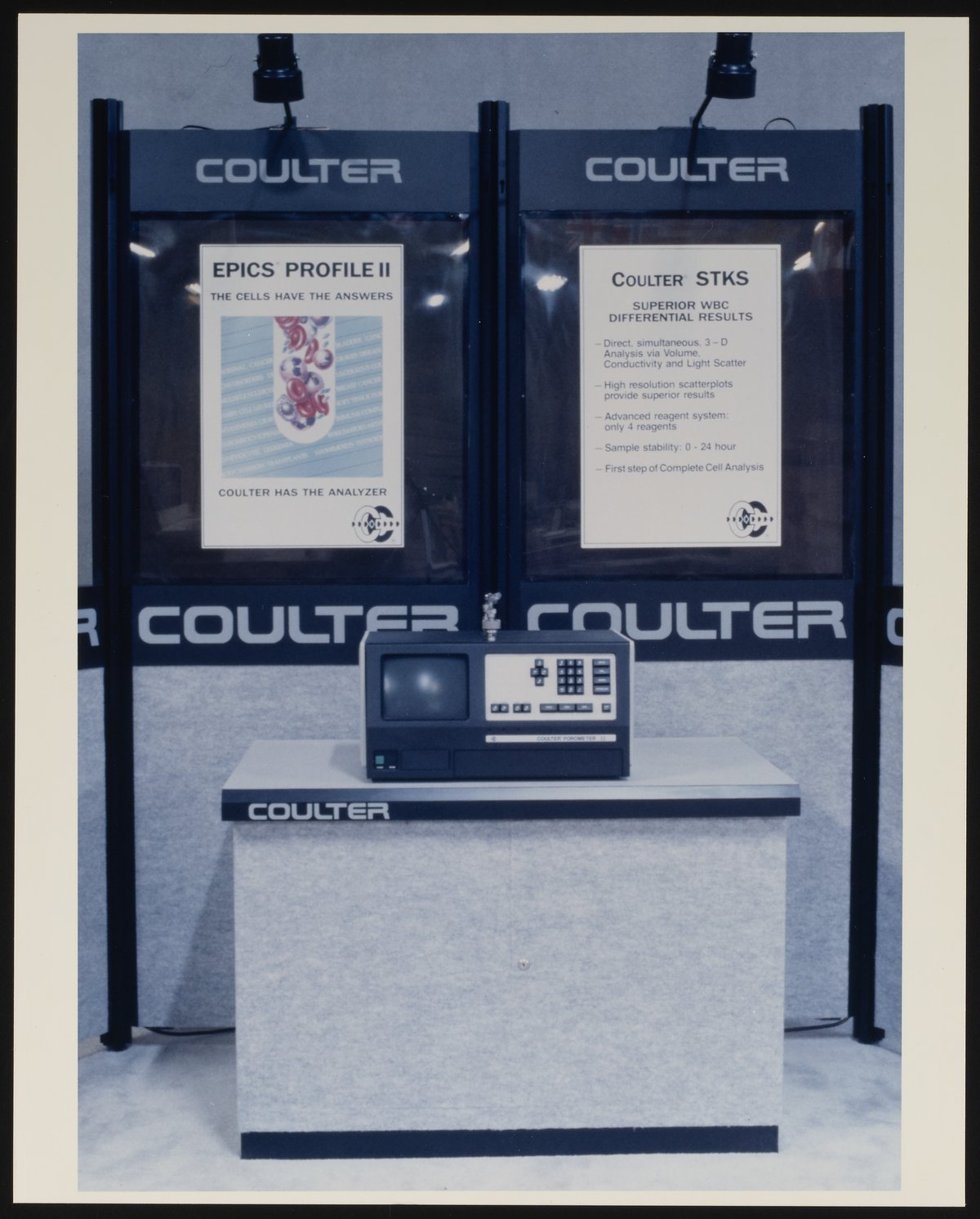 A blood cell counter system on display at what is likely a trade show. This technology is based on the Coulter principle and the the Coulter Counter, which quantifies and sizes particles suspended in a fluid, like blood cells, bacteria, and a wide variety of other substances. The Coulter principle was discovered by Wallace H Coulter in the late 1940s and patented in 1953. The Coulter counter was manufactured by Coulter Corporation until 1997, when the company was acquired by Beckman Instruments and became known as Beckman Coulter, Inc.