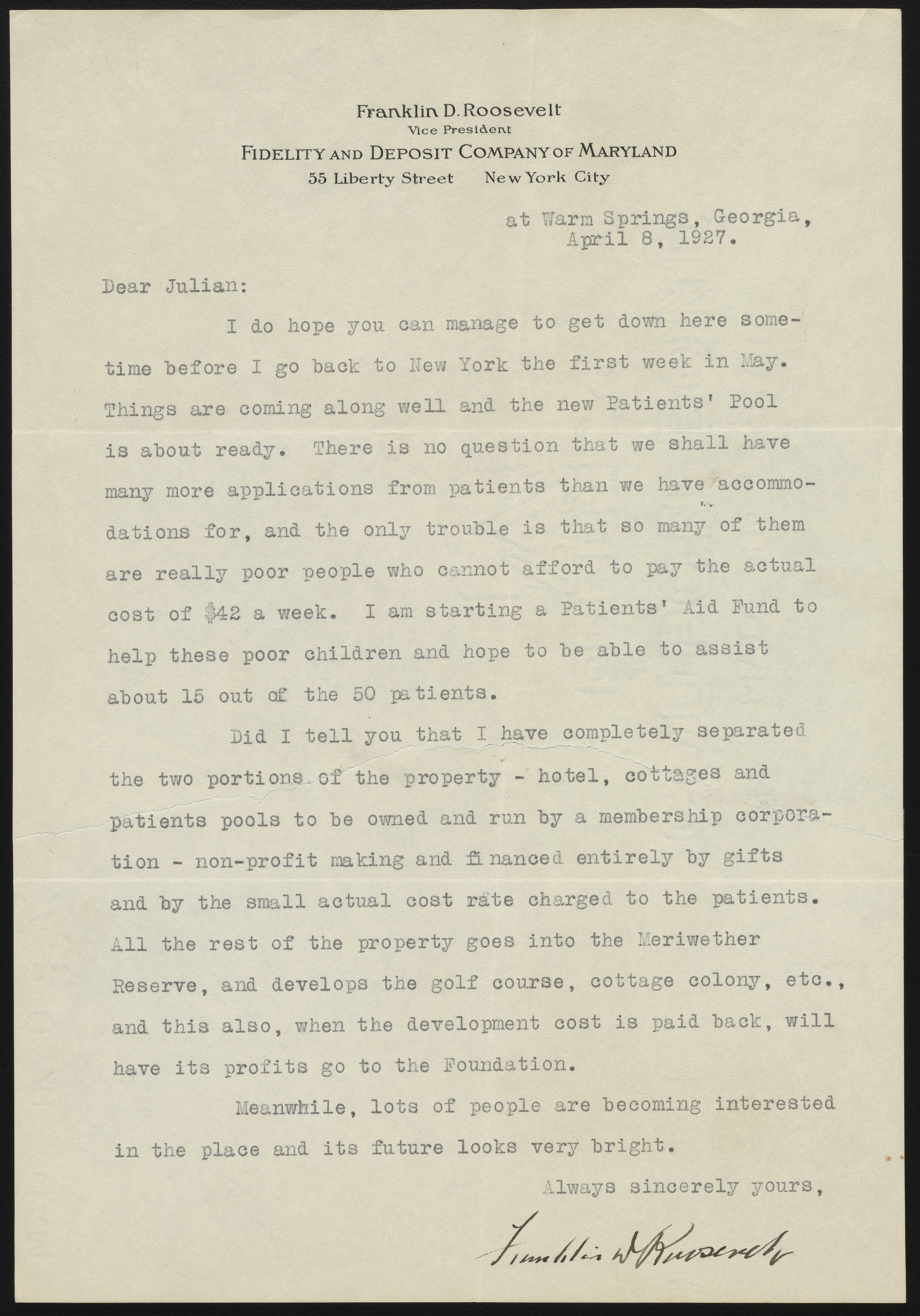 Letter by Franklin Delano Roosevelt concerning the construction of polio rehabilitation facility