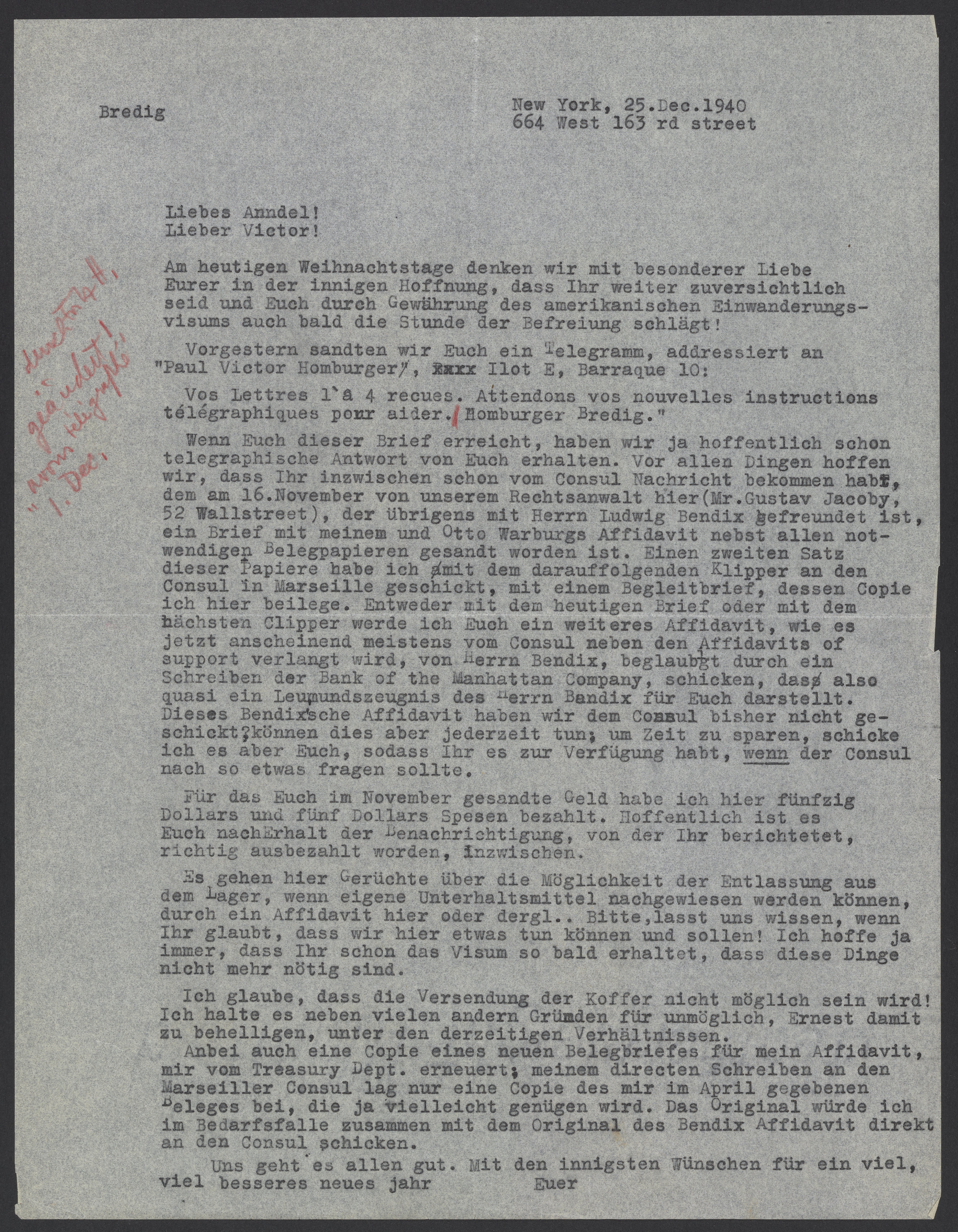 Wenn Euch dieser Brief erreicht, haben wir ja hoffentlich schon telegraphische Antwort von Euch erhalten. Vor allen Dingen hoffen wir, dass Ihr inzwischen schon vom Consul Nachricht bekommen habt, dem am 16 November von unserem Rechtsanwalt hier (Mr. Gustav Jacoby, 52 Wallstreet), der übrigens mit Herrn Ludwig Bendix befreundet ist, ein Brief mit meinem und Otto Warburgs Affidavit nebst allen notwendigen Belegpapieren gesandt worden ist. Einen zweiten Satz dieser Papiere habe ich mit dem darauffolgenden Klipper an dem Consul in Marseille geschickt mit einem Begleitbrief, dessen Copie ich hier beilege. Entweder mit dem heutigen Brief oder mit dem nächsten Clipper werde ich Euch ein weiteres Affidavit, wie es jetzt anscheinend meistens vom Consul neben Affidavits of support verlangt wird, von Herrn Bendix, beglaubigt durch ein Schreiben der Bank of the Manhattan Company, schicken, das also quasi ein Leumundszeugnis des Hernn Bendix für Euch darstellt. Dieses Bendixsche Affidavit haben wir dem Consul bisher nicht geschickt, können dies aber jederzeit tun; um Zeit zu sparen, schicke ich es aber Euch, sodass Ihr es zur Verfügung habt, wenn der Consul nach so etwas fragen sollte.