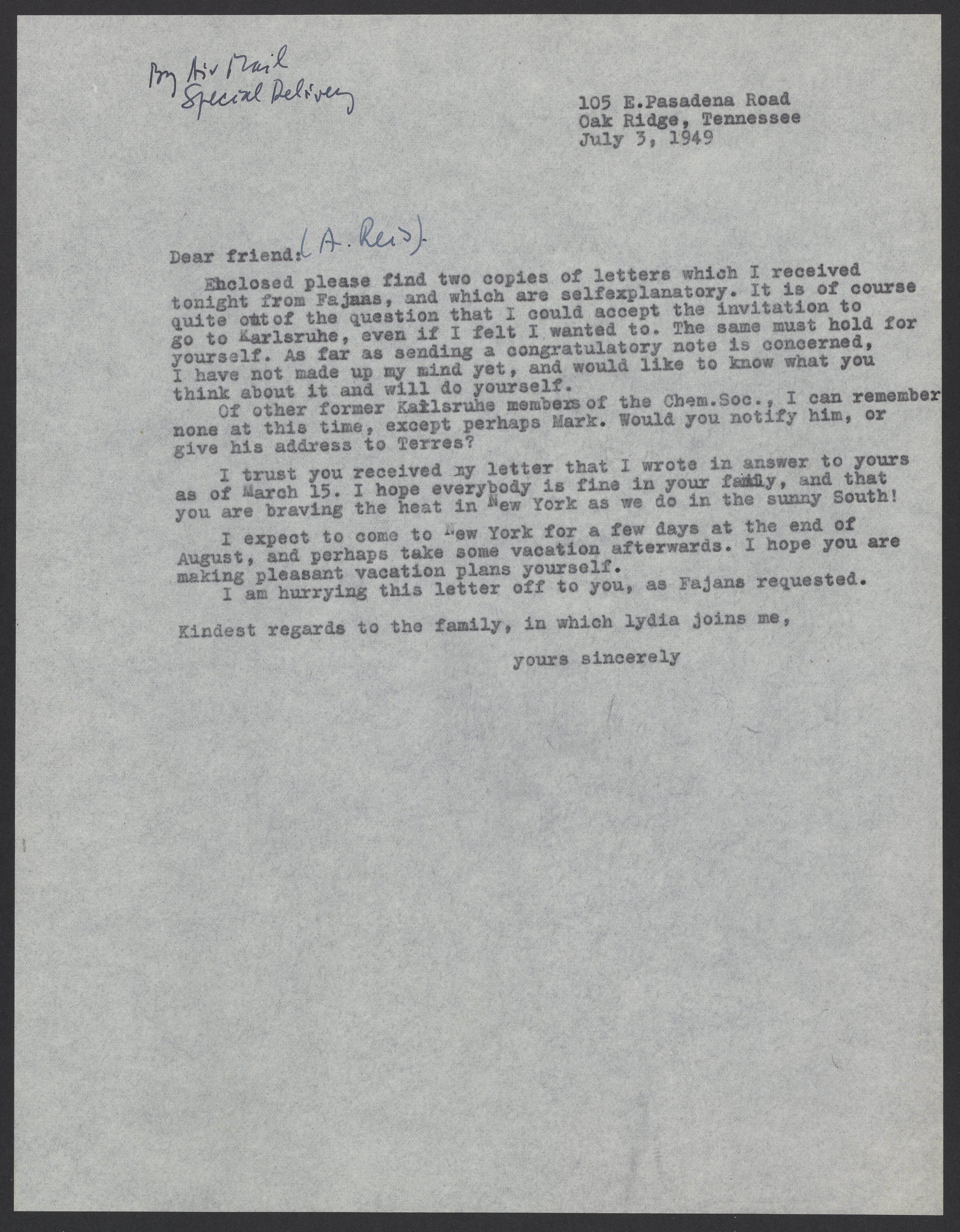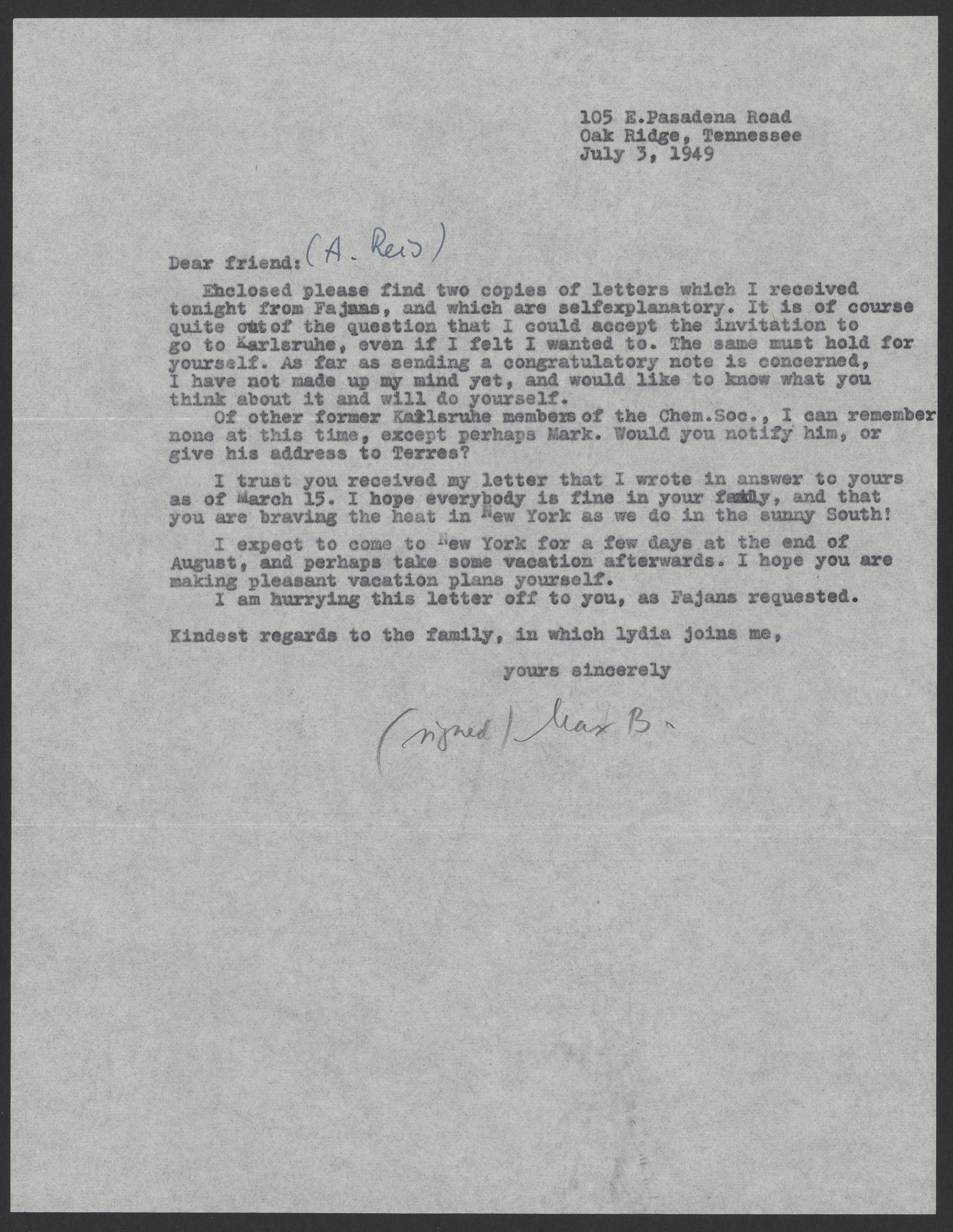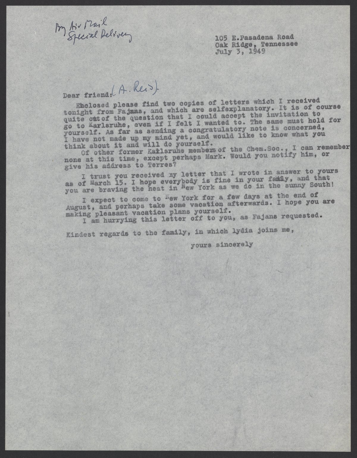 Letter from Max Bredig to Alfred Reis, July 3, 1949