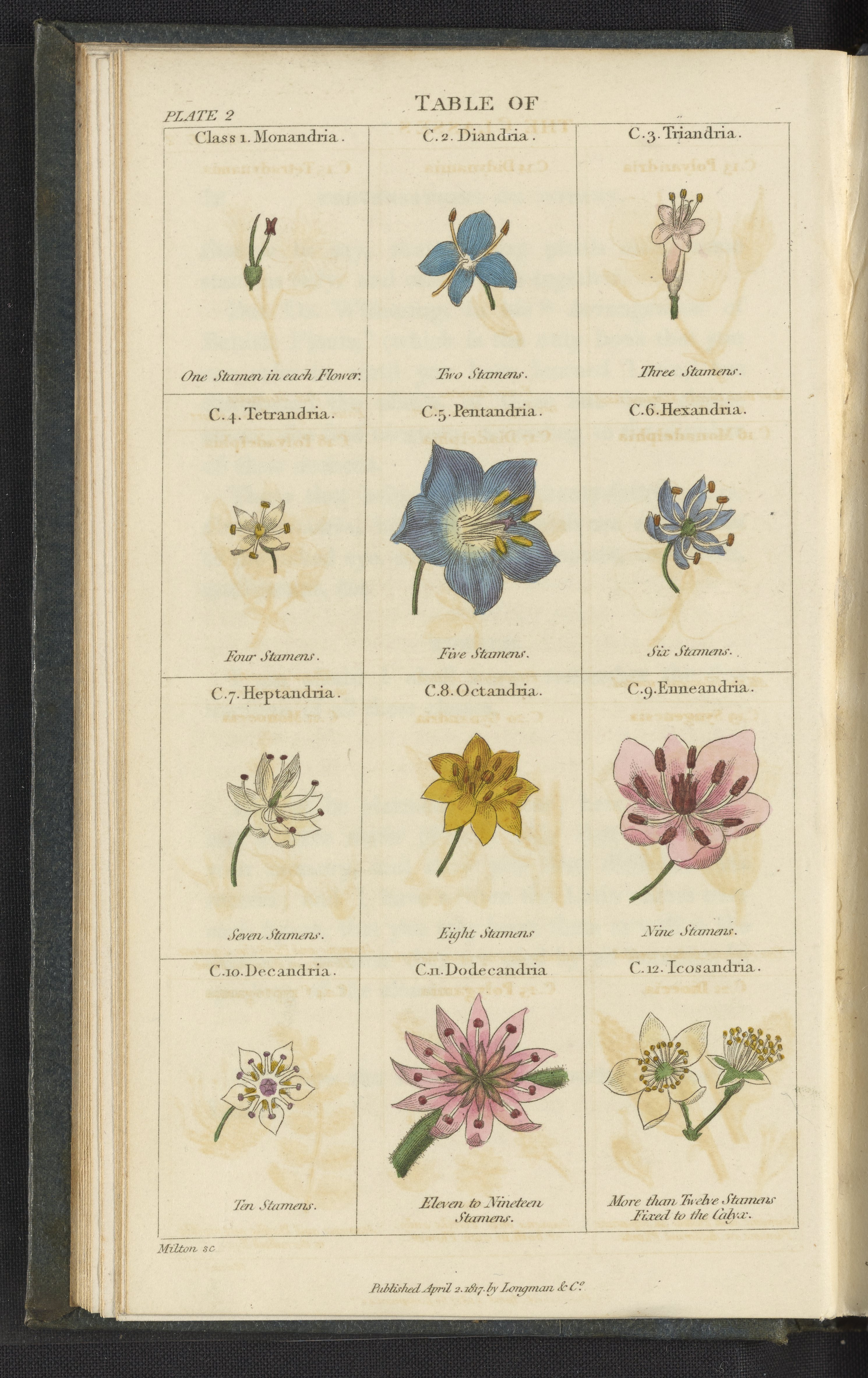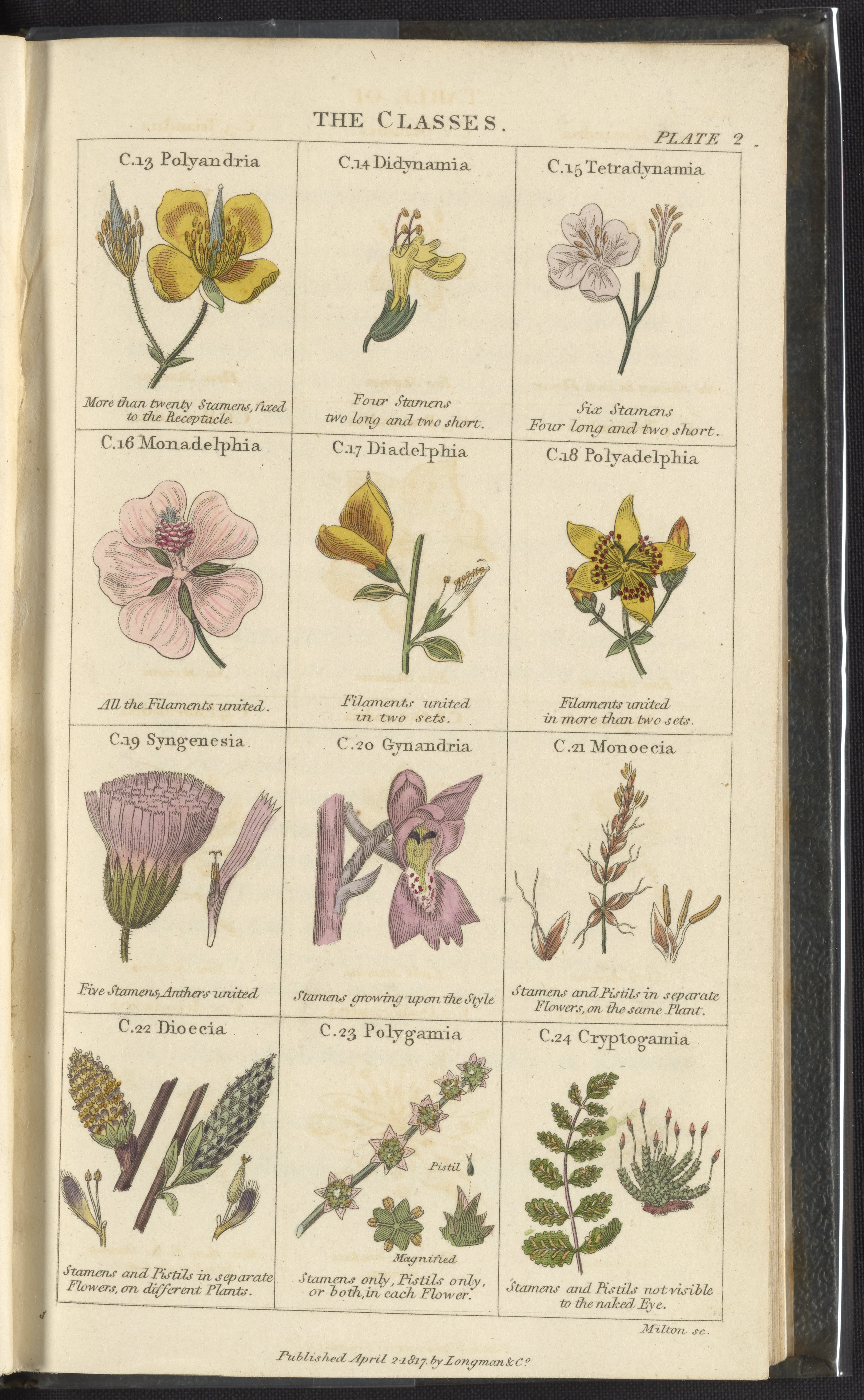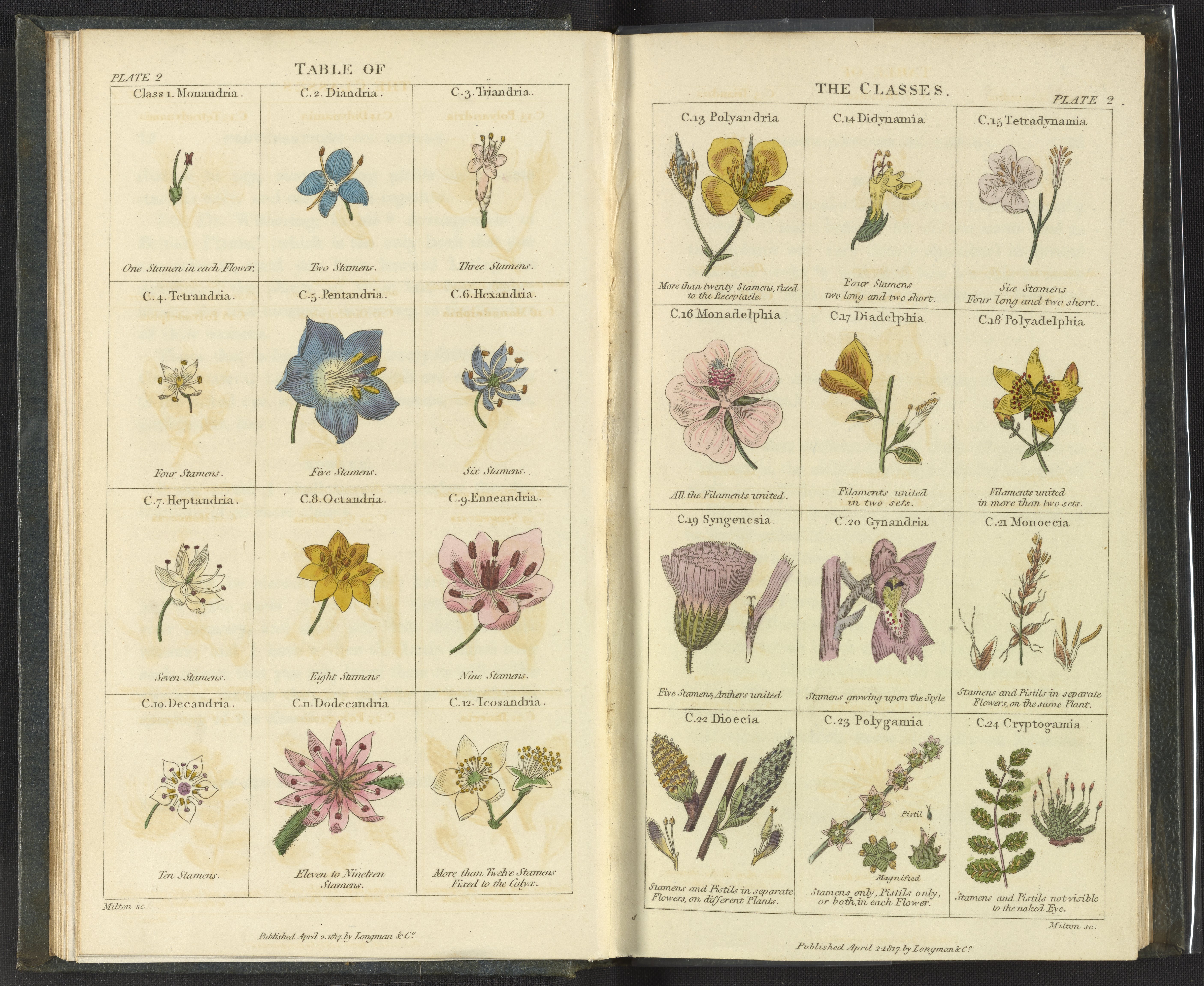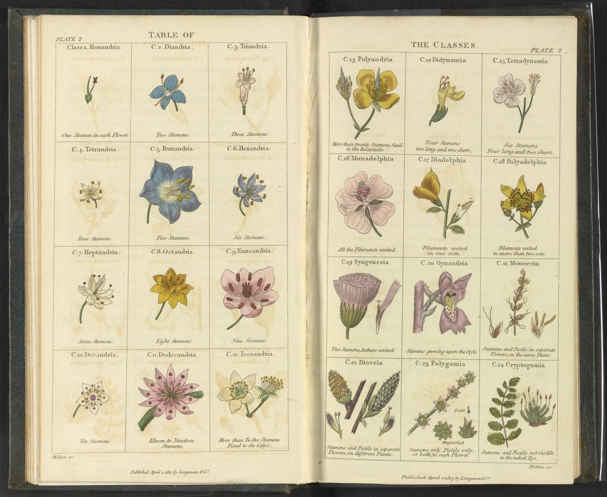Hand-colored lithograph with examples of the 24 botanical taxonomic classes: Monandria, Diandria, Triandria, Tetrandria, Pentandria, Hexandria, Heptandria, Octandria, Enneandria, Decandria, Dodecandria, Icosandria, Polyandria, Didynamia, Tetradynamia, Monadelphia, Diadelphia, Polyadelphia, Syngenesia, Gynandria, Monoecia, Dioecia, Polygamia, and Cryptogamia.