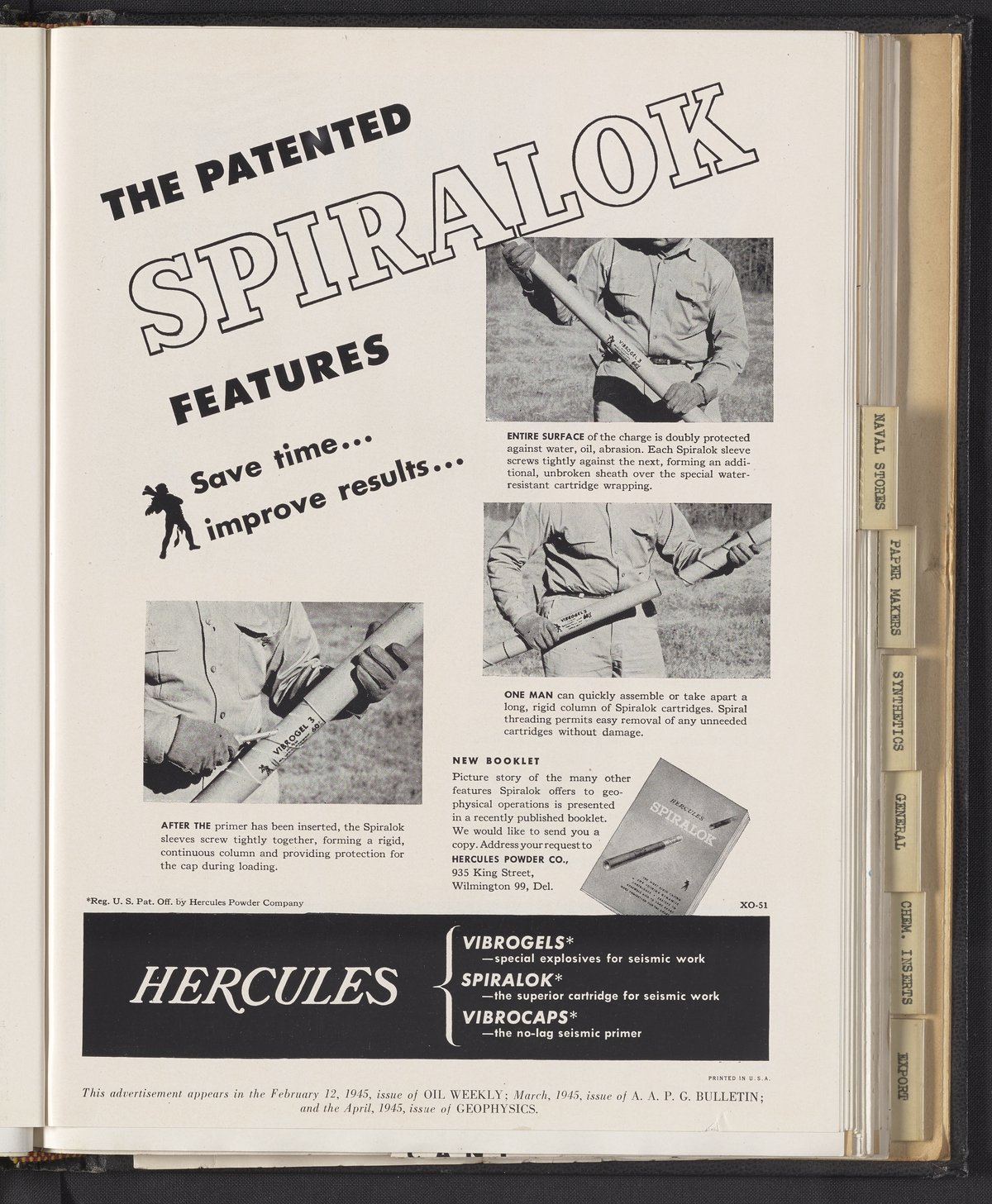 Hercules Incorporated. “The Patented Spiralok Features: Save Time...Improve Results...” 1945 Hercules Advertisements, 1945. Records of Hercules Incorporated, Volume 1945. Science History Institute. Philadelphia. https://digital.sciencehistory.org/works/1544bp76j.