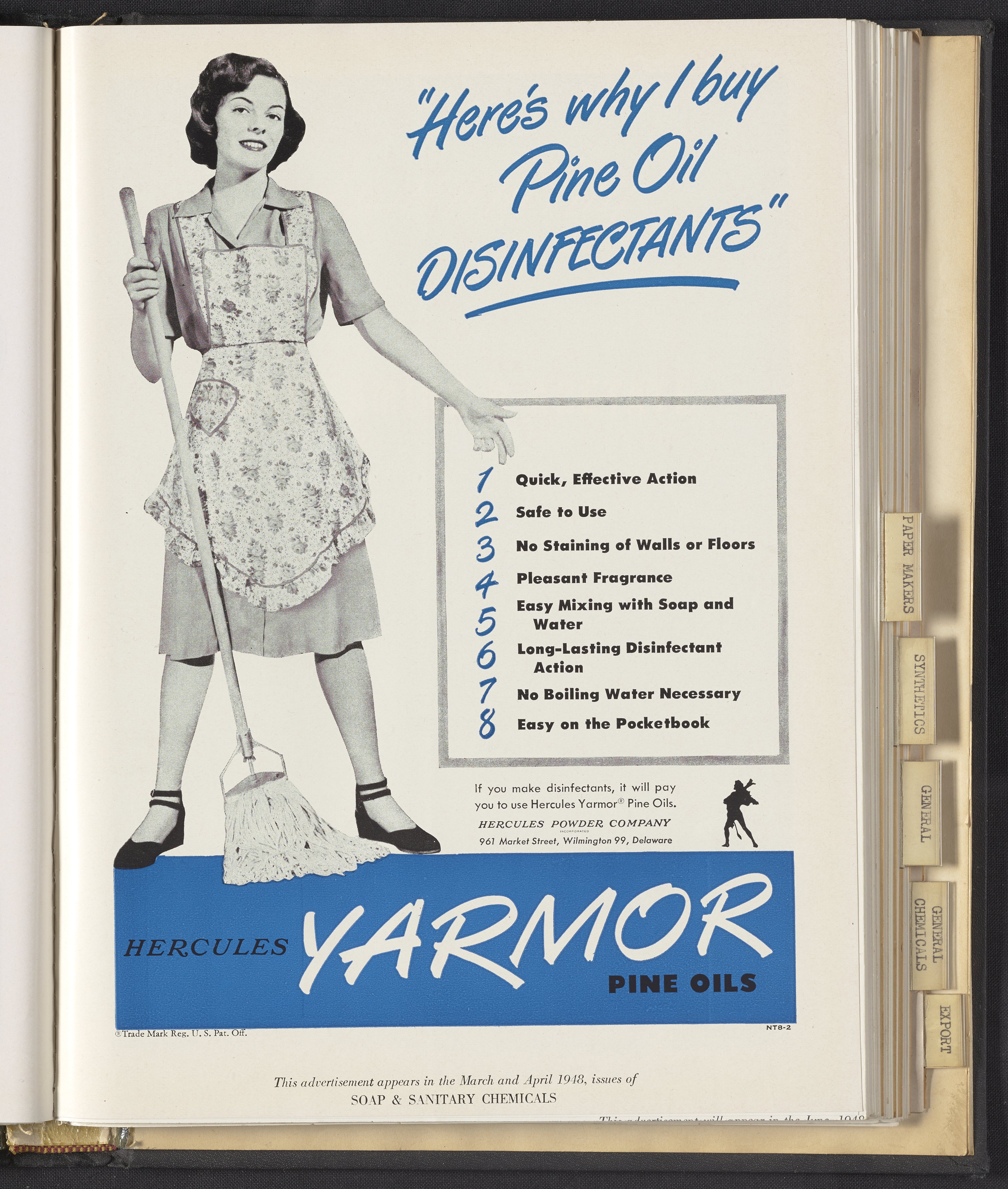 Hercules Incorporated. “‘Here's Why I Buy Pine Oil Disinfectants.’” 1948 Hercules Advertisements, 1948. Records of Hercules Incorporated, Volume 1948. Science History Institute. Philadelphia. https://digital.sciencehistory.org/works/1831ck82x.