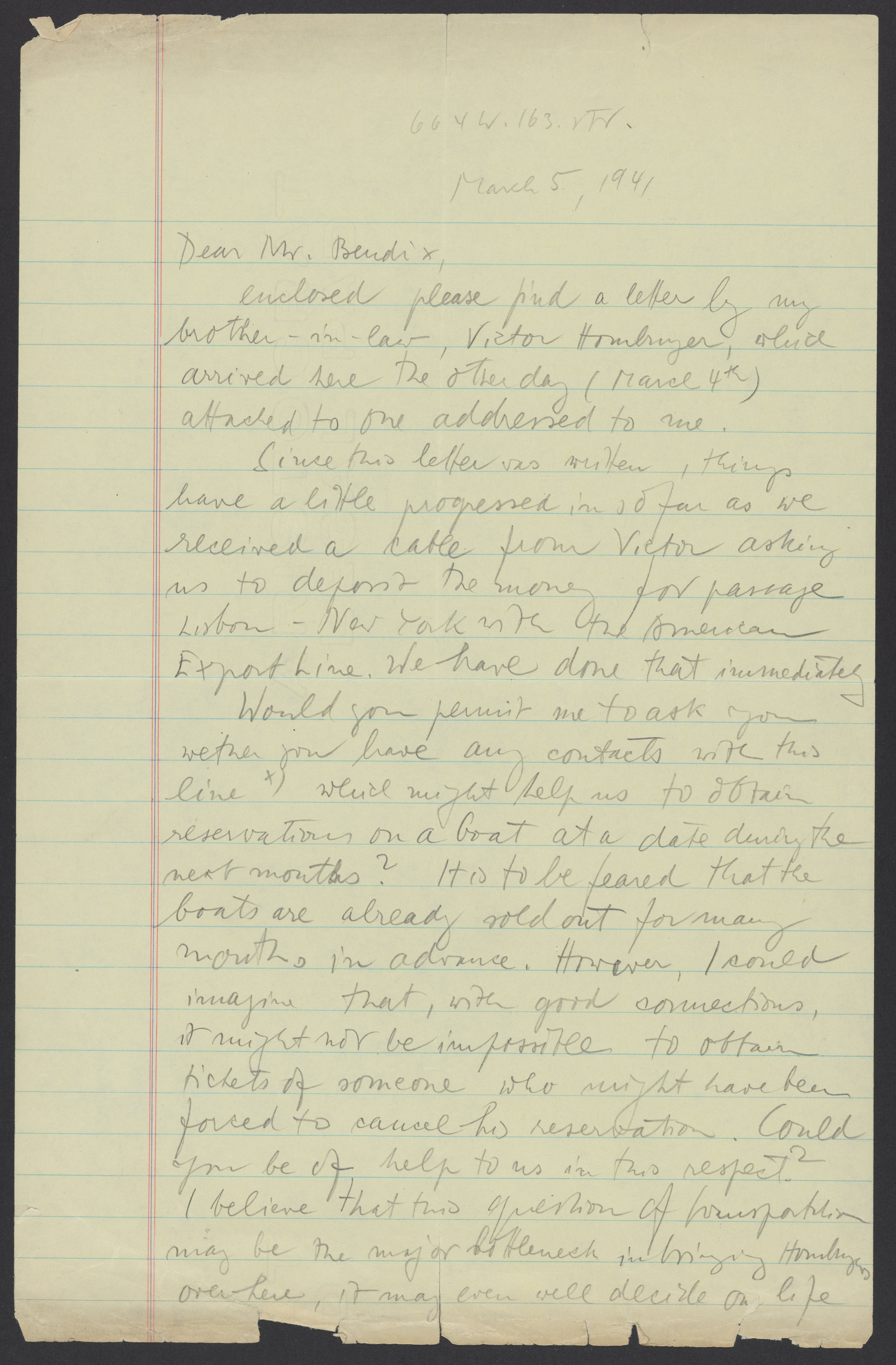 Small JPG1200 x 1828px — 277 KBLarge JPG2880 x 4388px — 1.5 MBFull-sized JPG5131 x 7817px — 4.7 MBOriginal fileTIFF — 5131 x 7817px — 115 MBMax Bredig (1902-1977) writes to Ludwig Bendix (1877-1954) with news from his brother-in-law Viktor Homburger (1888-1968). Max inquires whether Bendix may be able to assist in obtaining a boat reservation for the immigration of the Homburgers.
