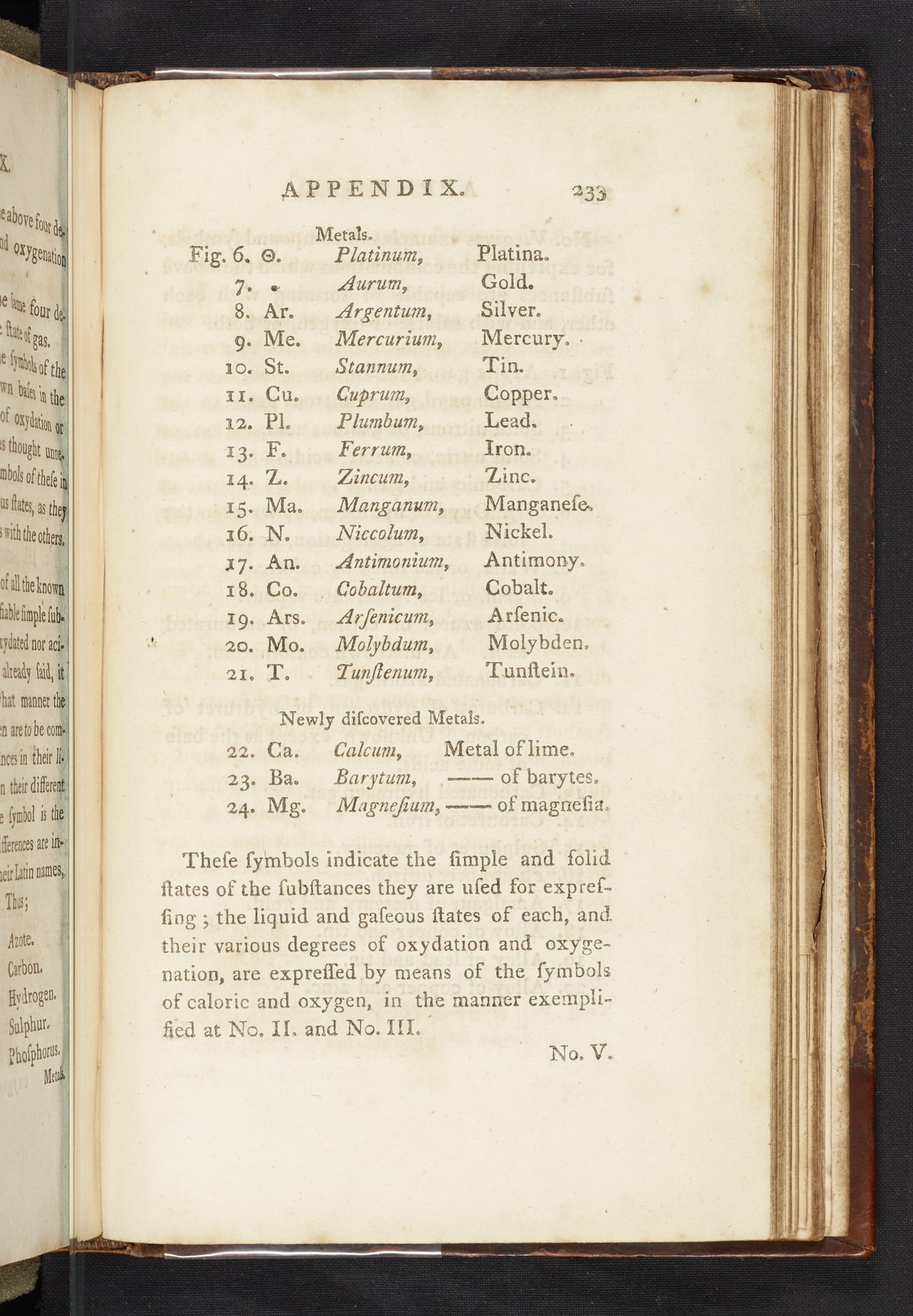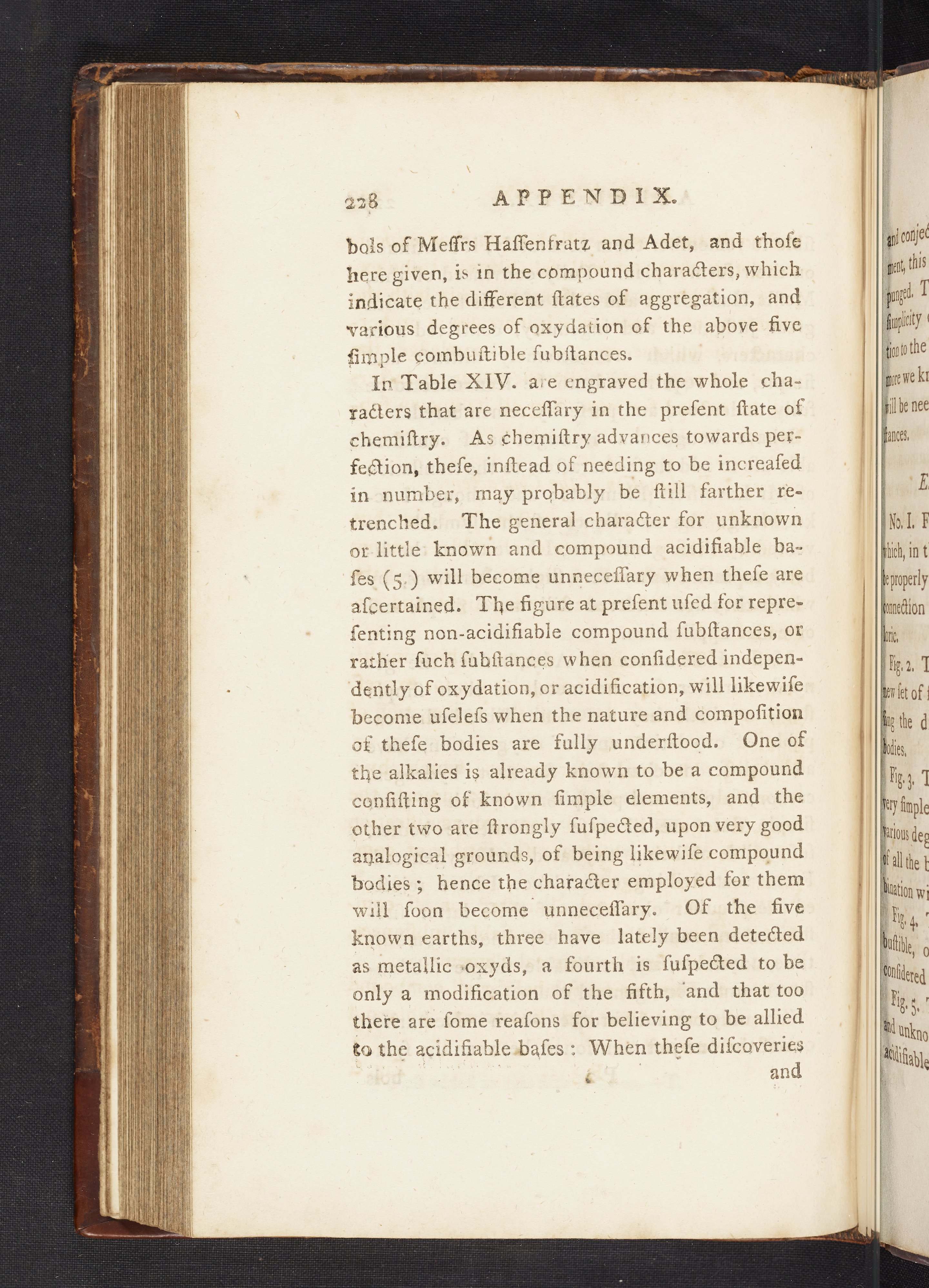 This edition included so many additions that it was necessary to divide it into two volumes. The appendix and addenda (pp. 226–255) contain the majority of the new material, including the first English translation of a paper by Jean Henri Hassenfratz (1755-1827) and Pierre-Auguste Adet (1763-1834), New System of Chemical Characters, adapted to the New Nomenclature, by Messrs Hassenfratz and Adet: with some Alterations by the Translator. Plate XIV illustrates the chemical symbols created by Hassenfratz and Adet. The addenda contain details on the newly discovered element columbium (i.e., niobium), carbon monoxide, nitrous oxide, and lactic acid, taken from A System of Chemistry (Edinburgh, 1802) by Thomas Thomson (1773-1852). Digitized content includes the work's appendix and plate XIV.