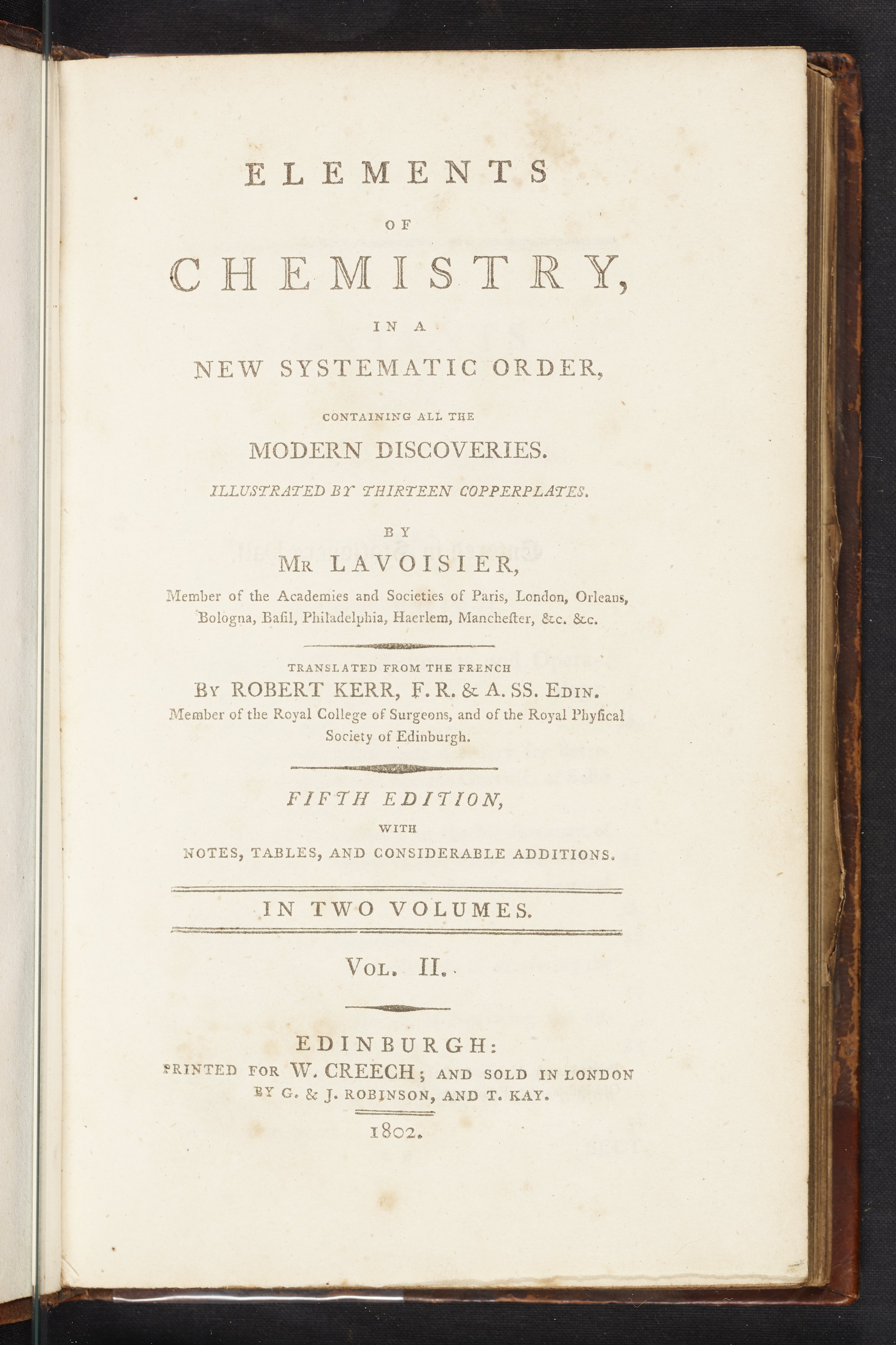 Small JPG1200 x 1801px — 248 KBLarge JPG2880 x 4322px — 1.2 MBFull-sized JPG3610 x 5418px — 1.7 MBOriginal fileTIFF — 3610 x 5418px — 56.0 MBThe fifth and final edition of Elements of chemistry translated to English by Scottish translator Robert Kerr (1755–1813), an ardent supporter of Lavoisier’s antiphlogistic chemistry. Kerr dedicated this fifth edition to his brother, Charles Kerr, of Calder-Bank. This printing is the first to contain an index to the whole work.