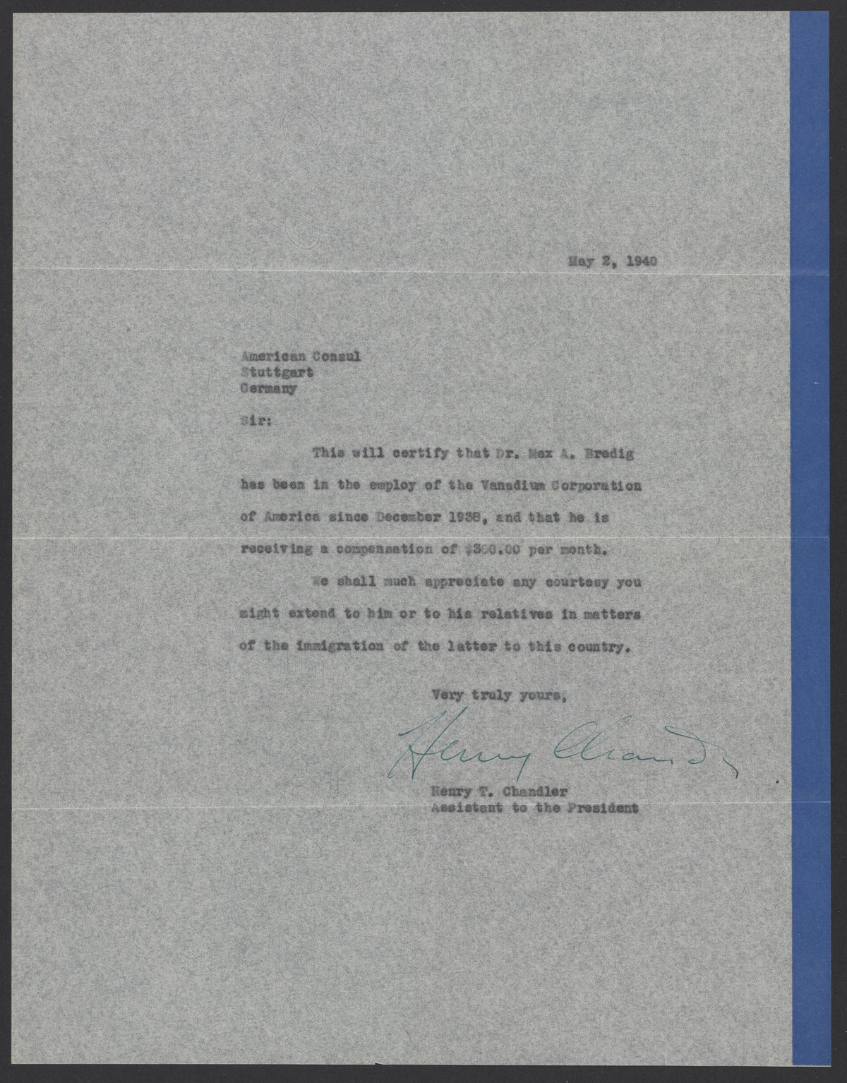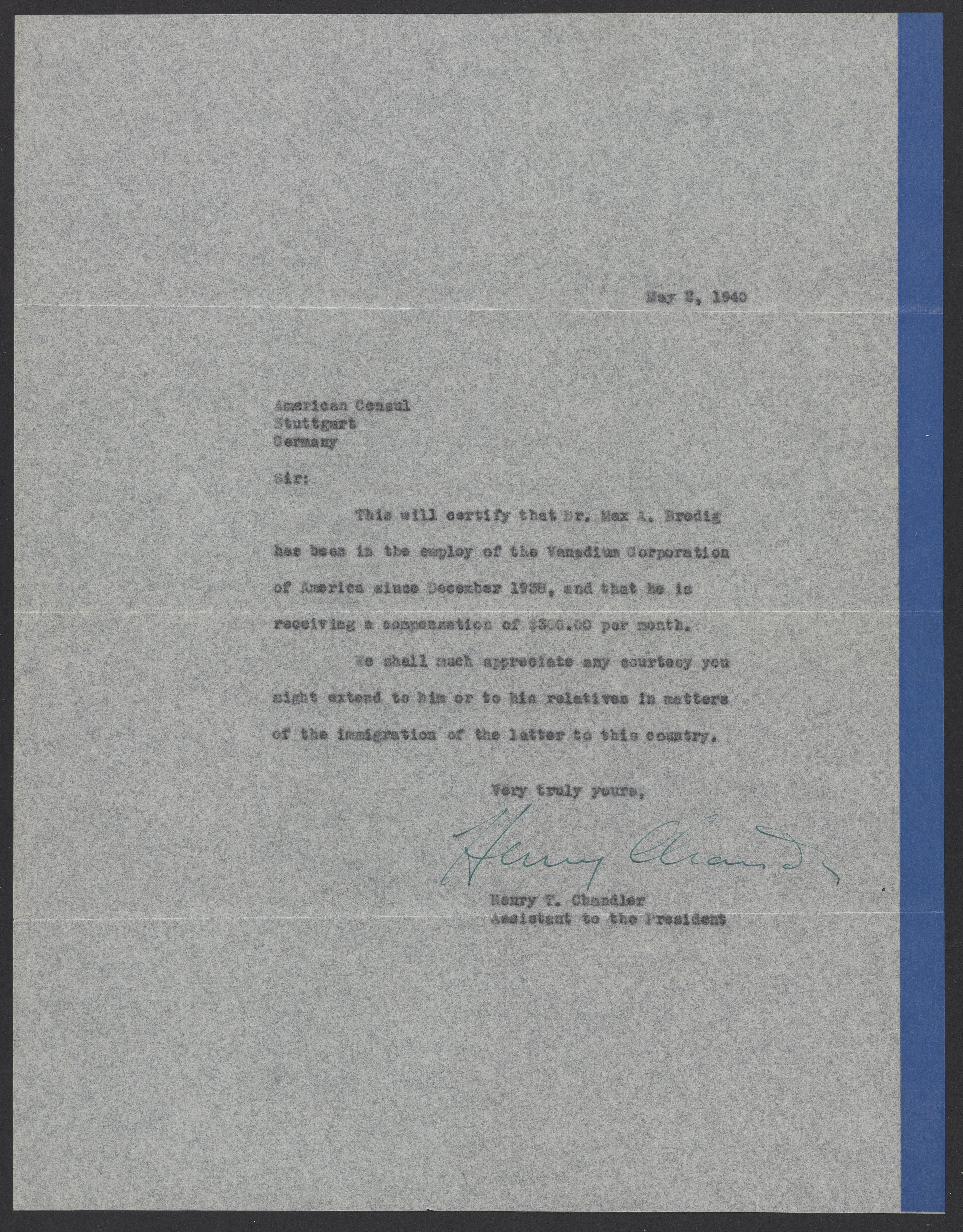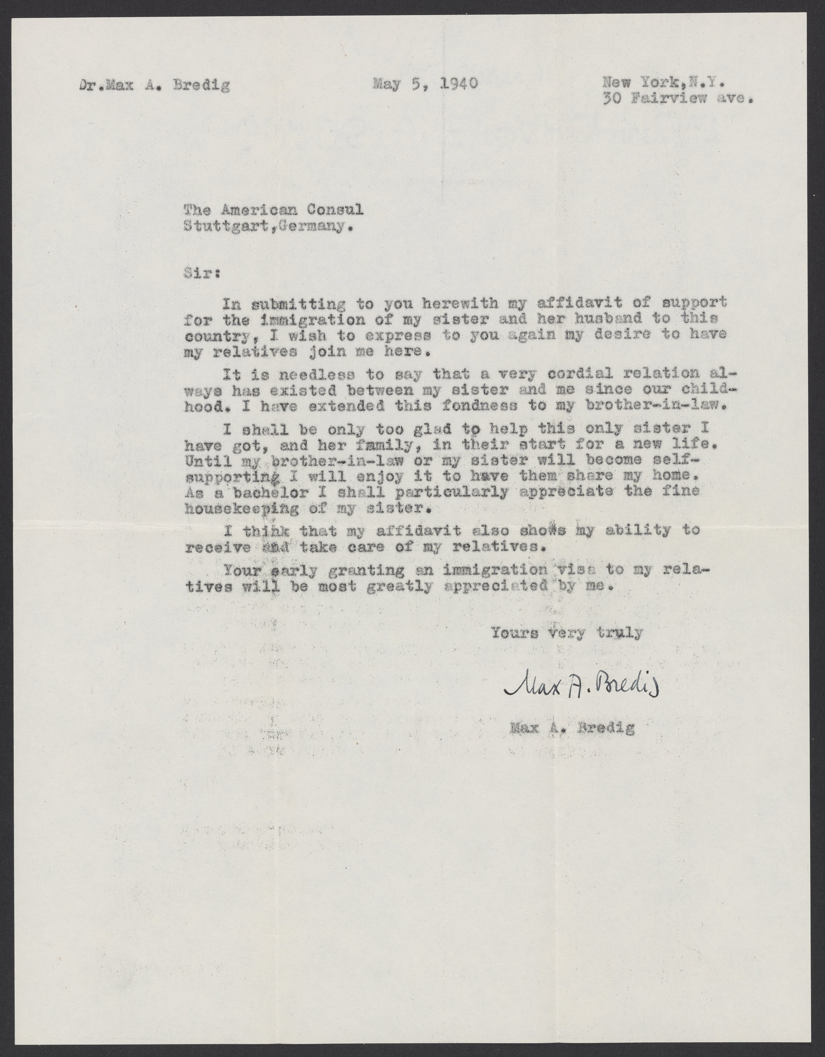 Letter from Max Bredig to the American Consul, May 5, 1940