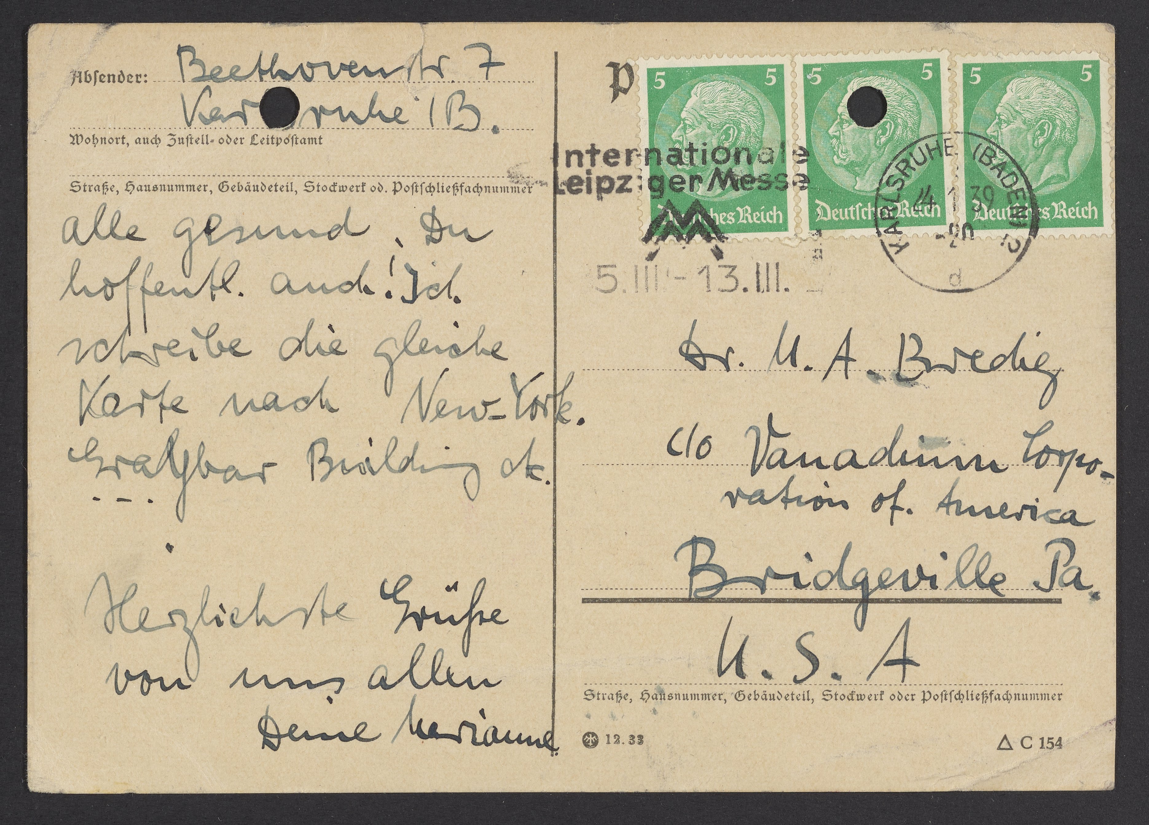alle gesund. Du hoffentlich auch! Ich schreibe die gleiche Karte nach New York. Graybar Building ---