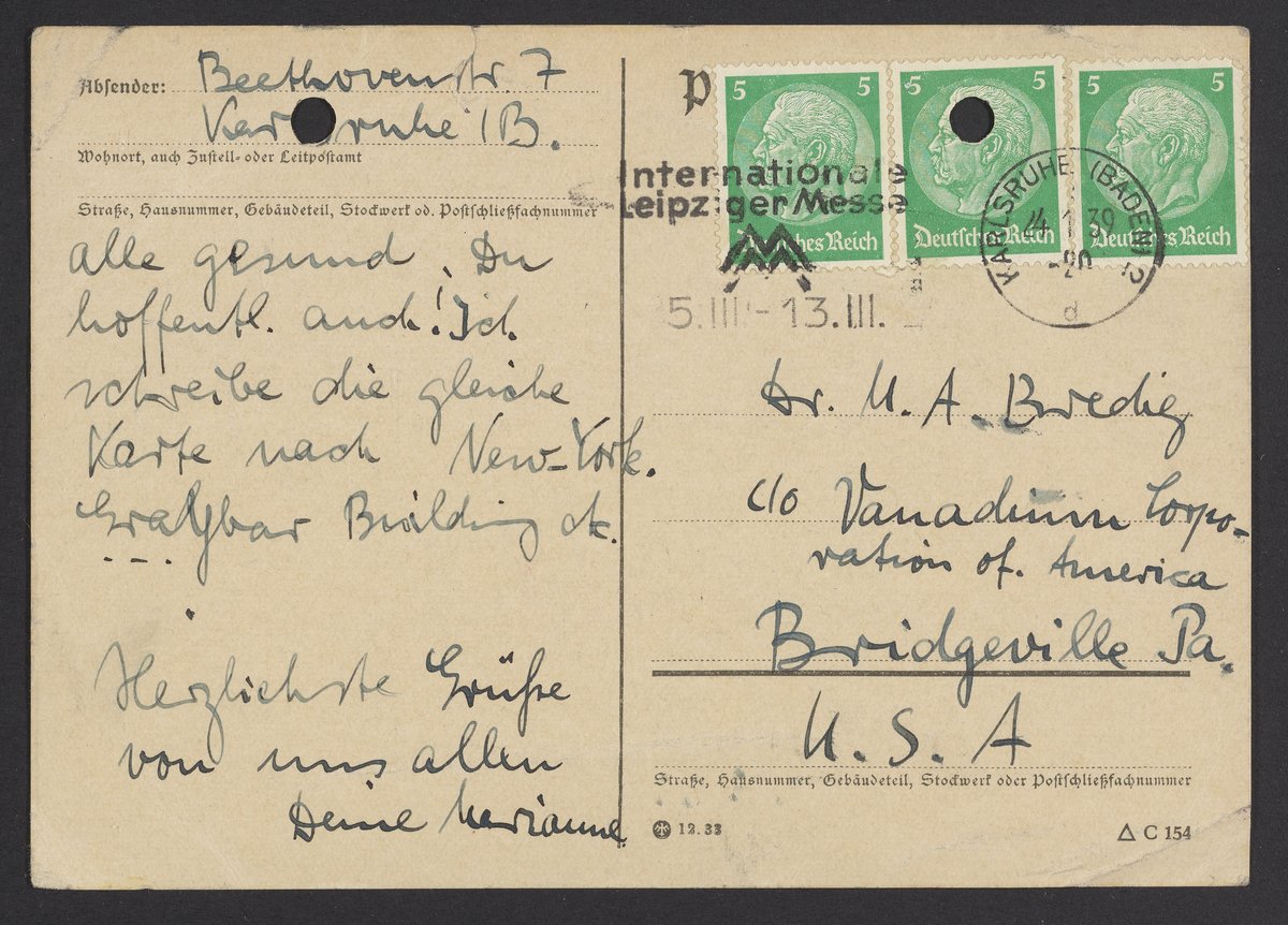 Homburger, Marianne. “Postcard from Marianne Homburger to Max Bredig, January 24, 1939,” January 24, 1939. Papers of Georg and Max Bredig, Box 8, Folder 18. Science History Institute. Philadelphia. https://digital.sciencehistory.org/works/1d2kfn7.