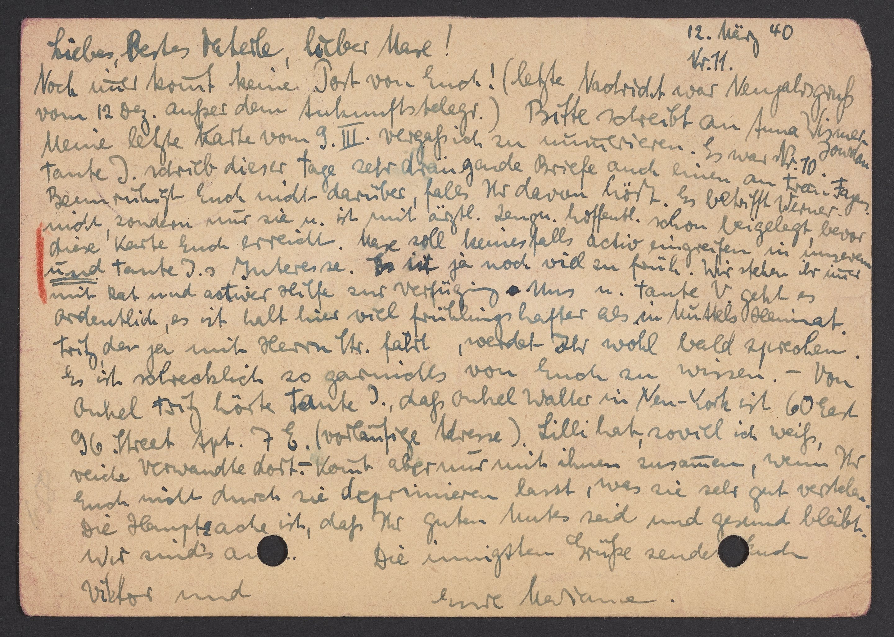 There is still no mail from you! (the last message was the New Year’s greeting on December 12th, except for the arrival receipt) Please write to Anna Wismer Jordan. I forgot to number my last postcard from March 9th. It was #10. Aunt I. wrote recently very urgent letters, including one to Mrs. Fajans. Don't worry if you hear about it. It doesn't concern Werner, only her. Hopefully the medical certificates are already enclosed before this postcard reaches you. In the interest of us and Aunt I., Max should by no means actively intervene. It's still too early. We are always available to advise and help her. We and Aunt V. are doing well. It's just a lot more spring-like here than in mother's homeland. You will probably talk to Fritz, who is traveling with Mr. W. It's awful not knowing anything about how you both are doing. Aunt I. heard from Uncle Fritz that Uncle Walter is in New York at 60 East 96th Street, Apt. 7E (temporary address). As far as I know, Lilli has wealthy relatives there. However, only visit with them if they don’t depress you, which they understand very well. The most important thing is that you both are happy and healthy. We are too.