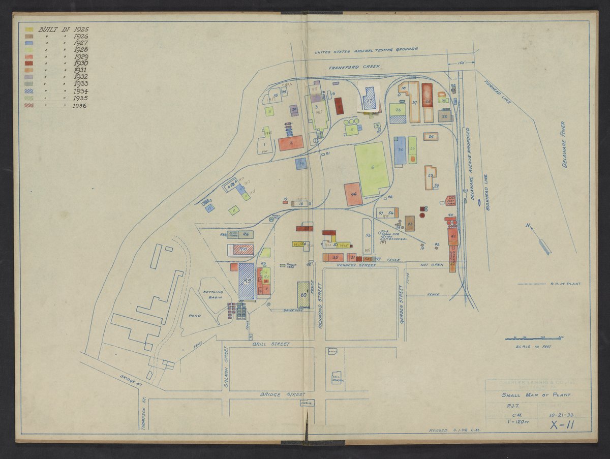 Map depicting the facility and grounds of the Charles Lennig and Company chemical manufacturing plant in Bridesburg, a neighborhood located along the Delaware River in the Northeast section of Philadelphia, Pennsylvania. The map is color-coded to indicate when each building was erected between 1925 and 1936. Charles Lennig and Company operated as a subsidiary of the Rohm and Haas Company, an international chemical company headquartered in Philadelphia, from 1920 to 1947.