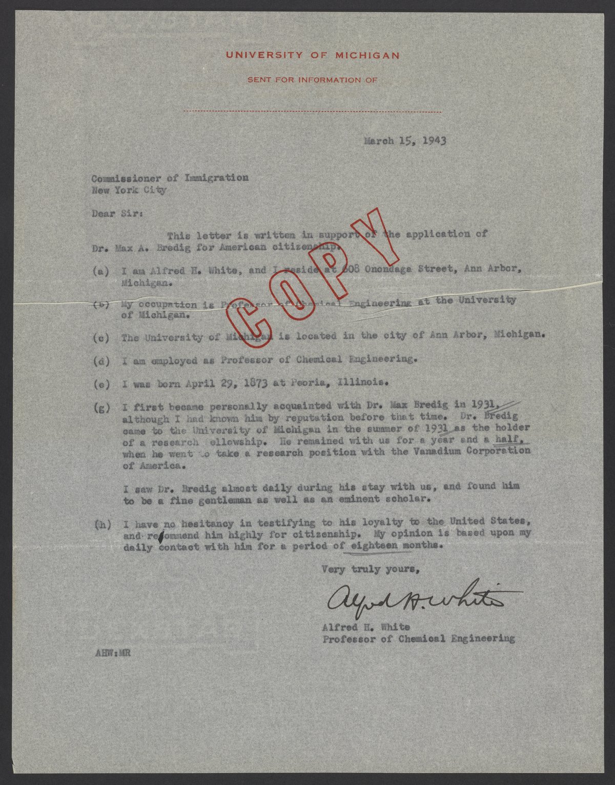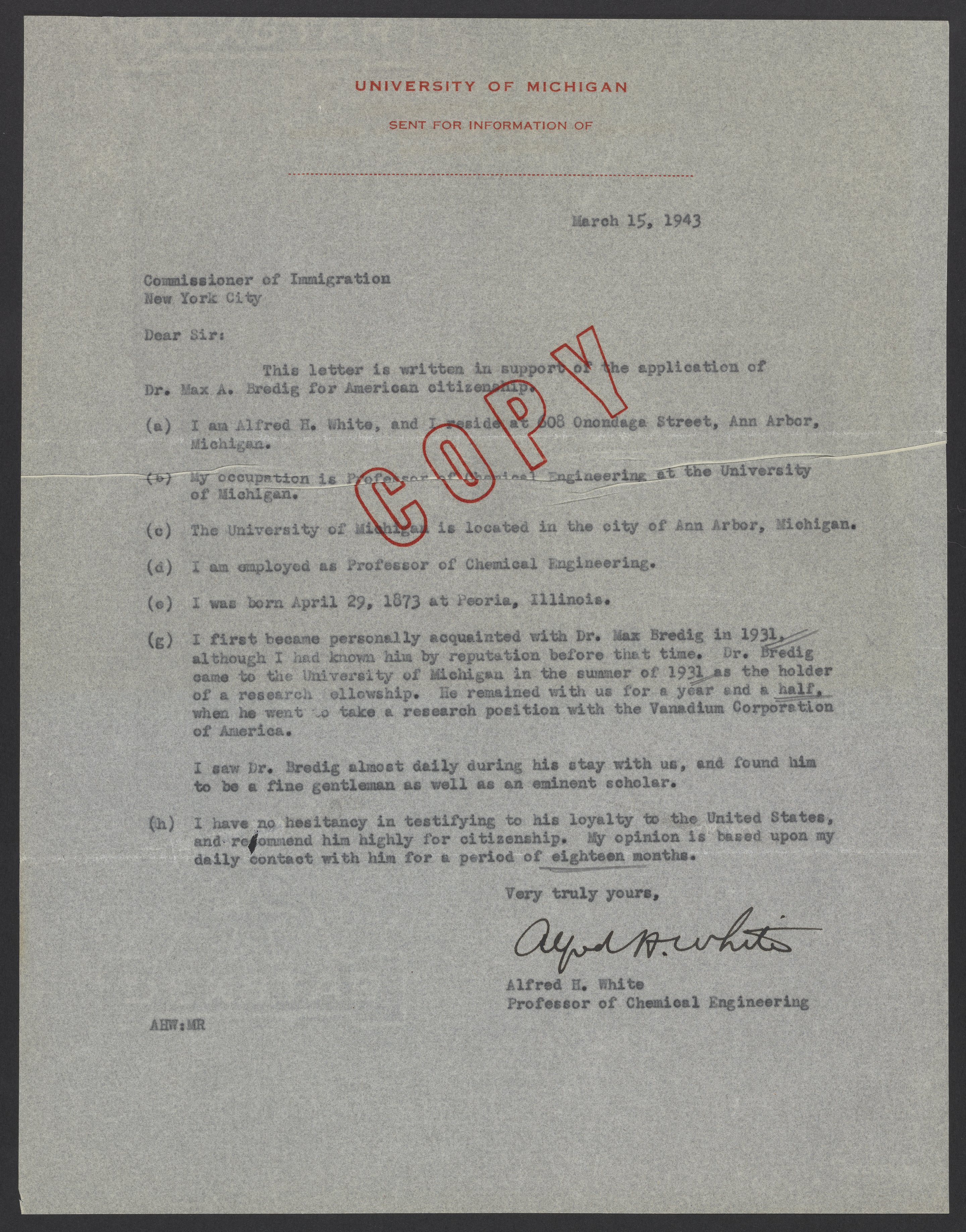 Testimony from Alfred H. White to the Commissioner of Immigration, March 15, 1943