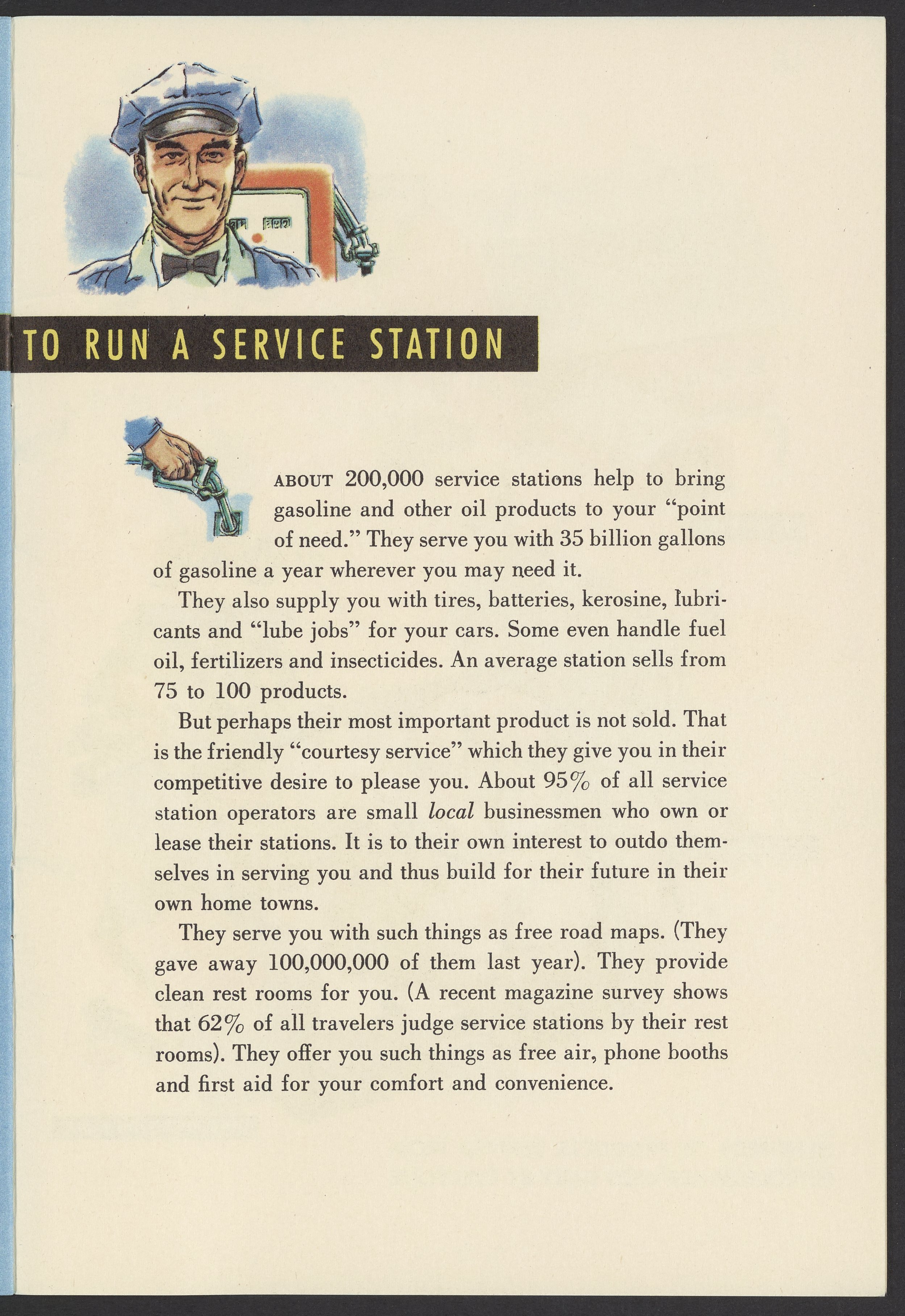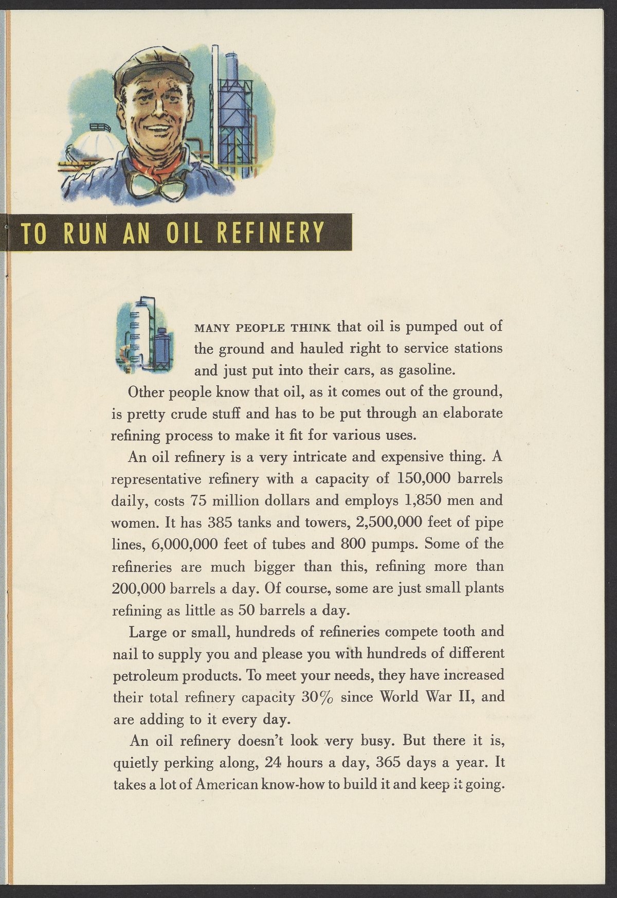 Small JPG1200 x 1738px — 442 KBFull-sized JPG2502 x 3624px — 2.8 MBOriginal fileTIFF — 2502 x 3624px — 25.9 MBIllustrated colorfully, this pamphlet describes how the production of oil positively affects daily American life and propagandizes the use of oil. Oil production is described sequentially: digging wells, refining, transporting, distributing, and running service stations.