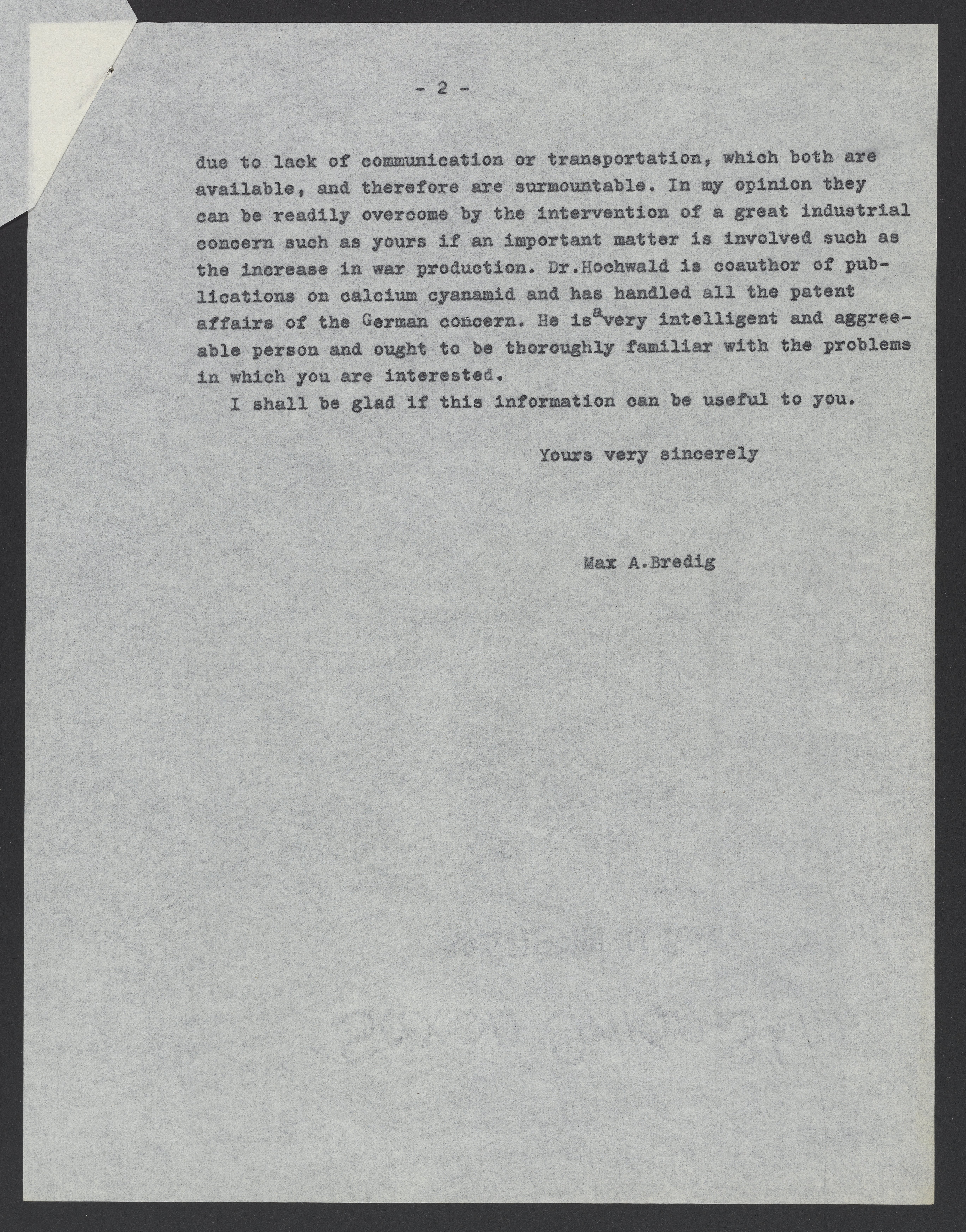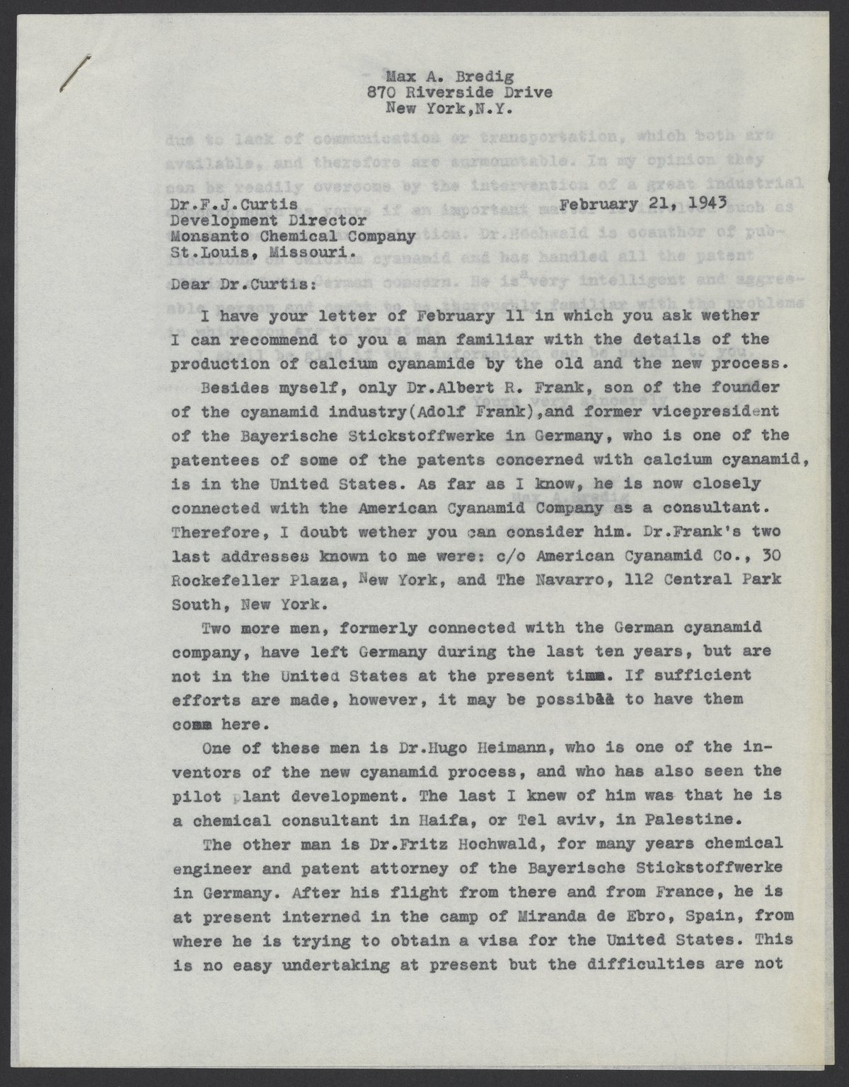 Small JPG1200 x 1537px — 329 KBLarge JPG2880 x 3689px — 2.0 MBFull-sized JPG5386 x 6899px — 6.8 MBOriginal fileTIFF — 5386 x 6899px — 106 MBMax Bredig (1902-1977) responds to Francis J. Curtis, development director of Monsanto Chemical Company, with a list of scientists who are familiar with calcium cyanimide production. Bredig strongly recommends his colleague Fritz Hochwald (1897-1968), and implies that an investment in Hochwald by Monsanto would expedite his release from the Miranda de Ebro internment camp and subsequent immigration to the United States.
