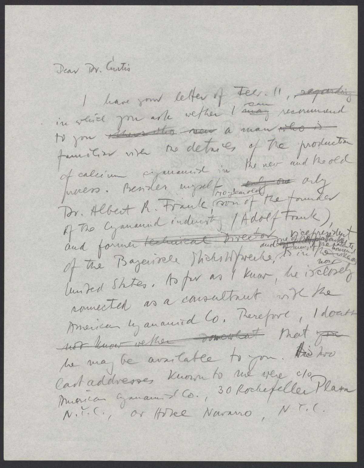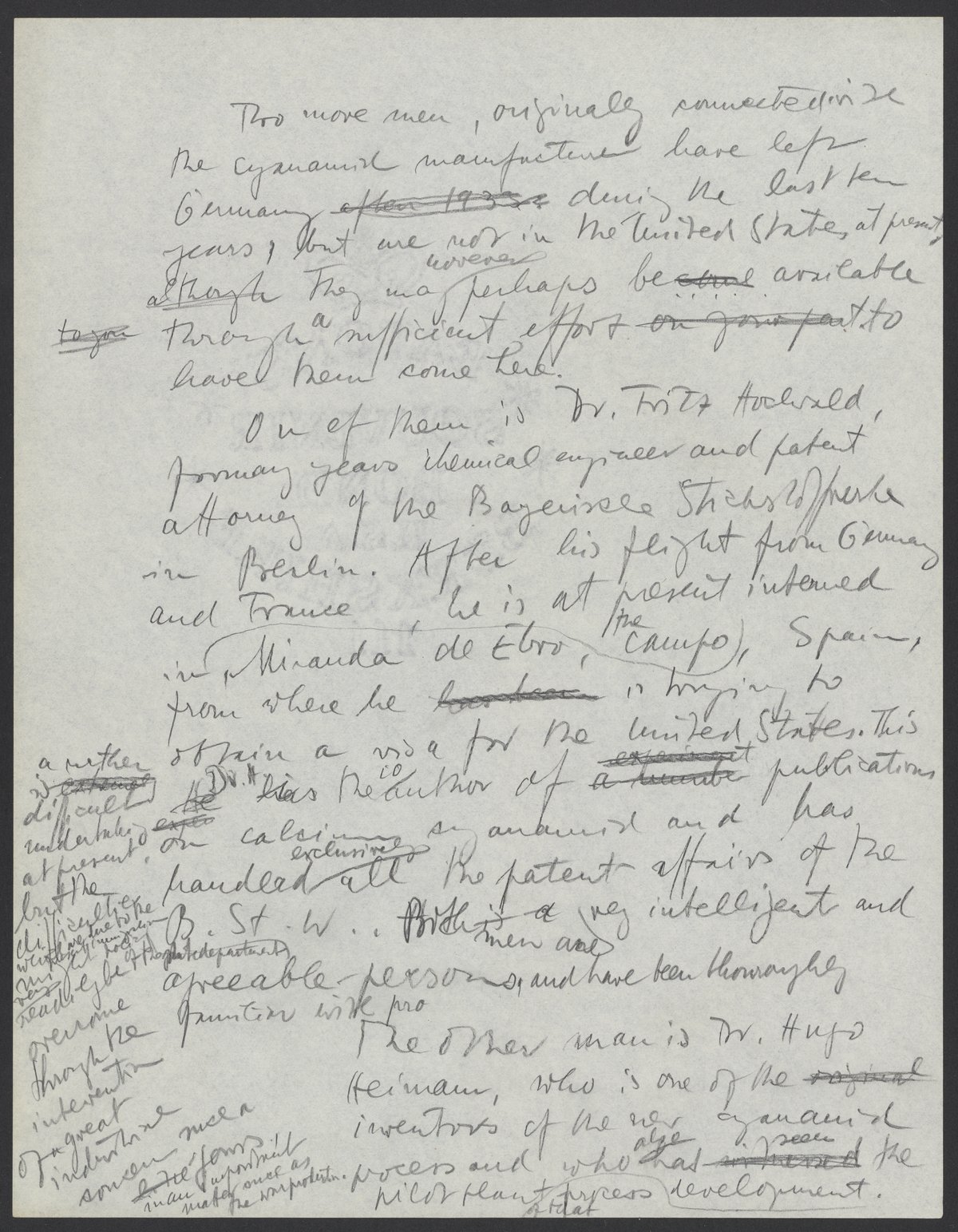 Small JPG1200 x 1537px — 329 KBLarge JPG2880 x 3689px — 2.0 MBFull-sized JPG5386 x 6899px — 6.8 MBOriginal fileTIFF — 5386 x 6899px — 106 MBMax Bredig (1902-1977) responds to Francis J. Curtis, development director of Monsanto Chemical Company, with a list of scientists who are familiar with calcium cyanimide production. Bredig strongly recommends his colleague Fritz Hochwald (1897-1968), and implies that an investment in Hochwald by Monsanto would expedite his release from the Miranda de Ebro internment camp and subsequent immigration to the United States.