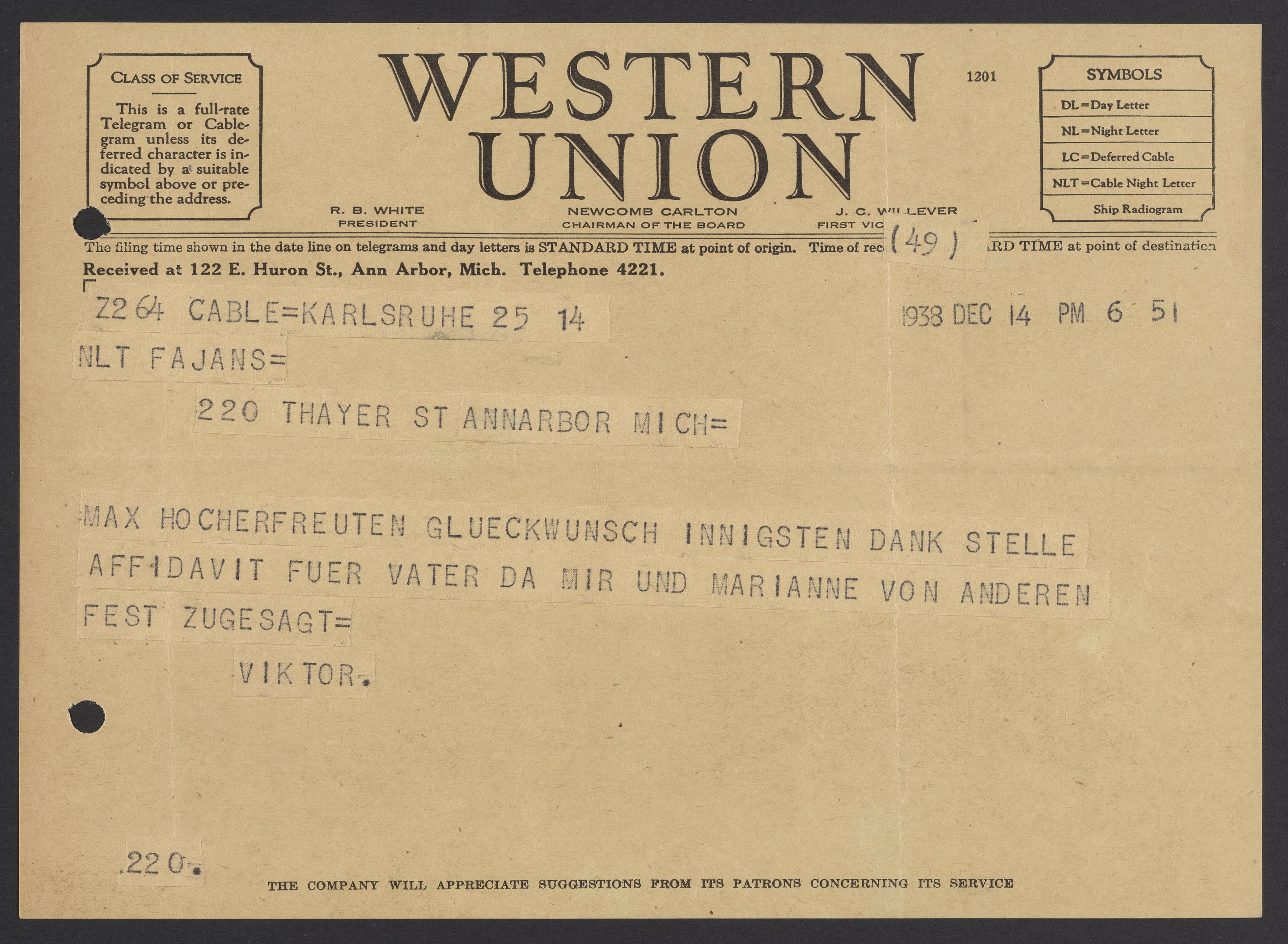 Telegram from Viktor Homburger to Max Bredig, December 14, 1938