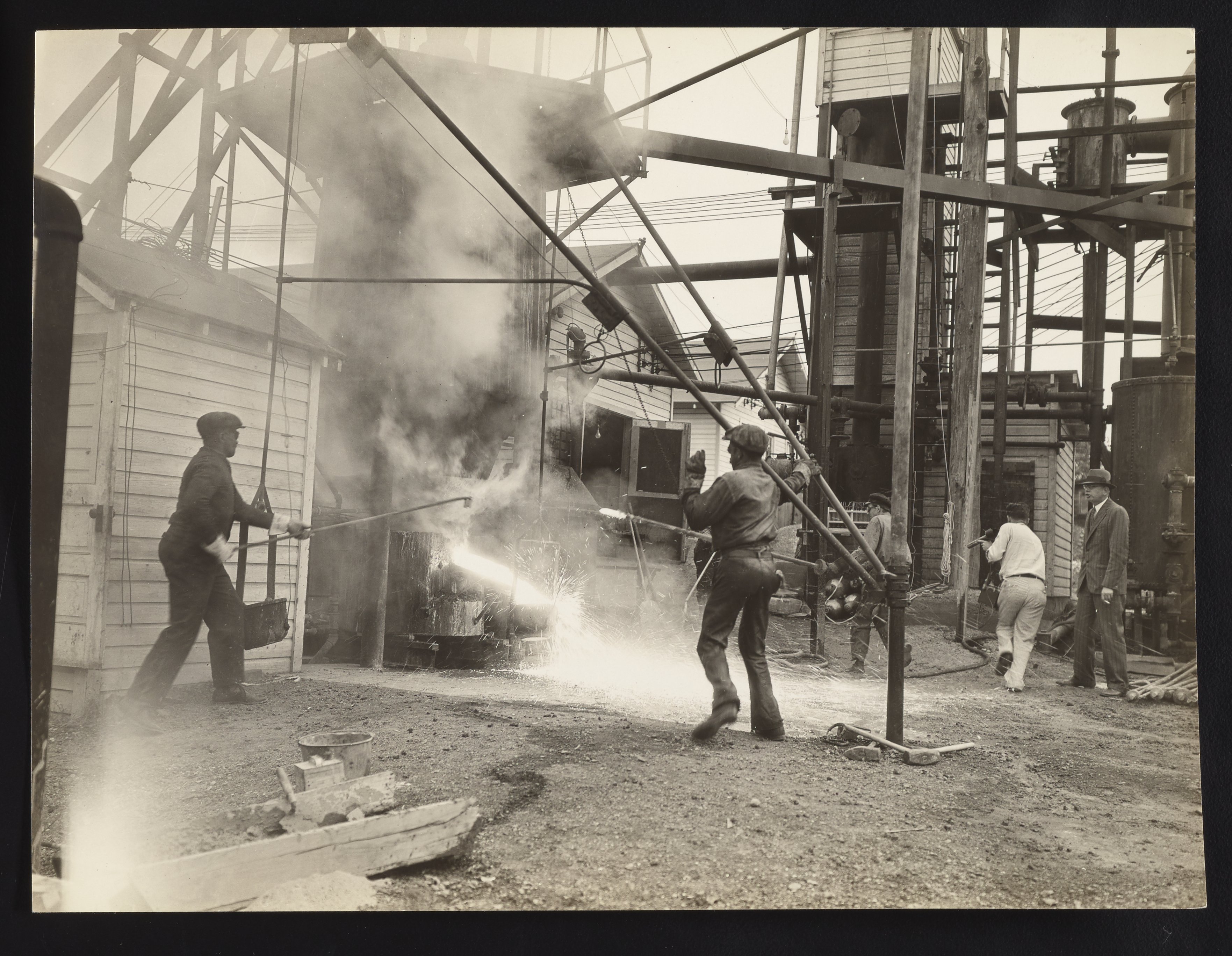 Employees opening cinder-notch on No. 2 experimental blast furnace