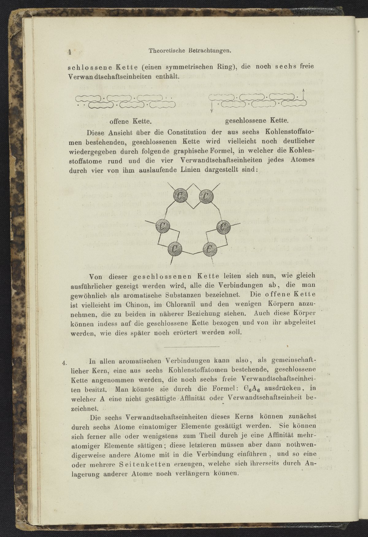 The illustration on this page is believed to be the earliest depiction of the chemical structure of a benzene ring.