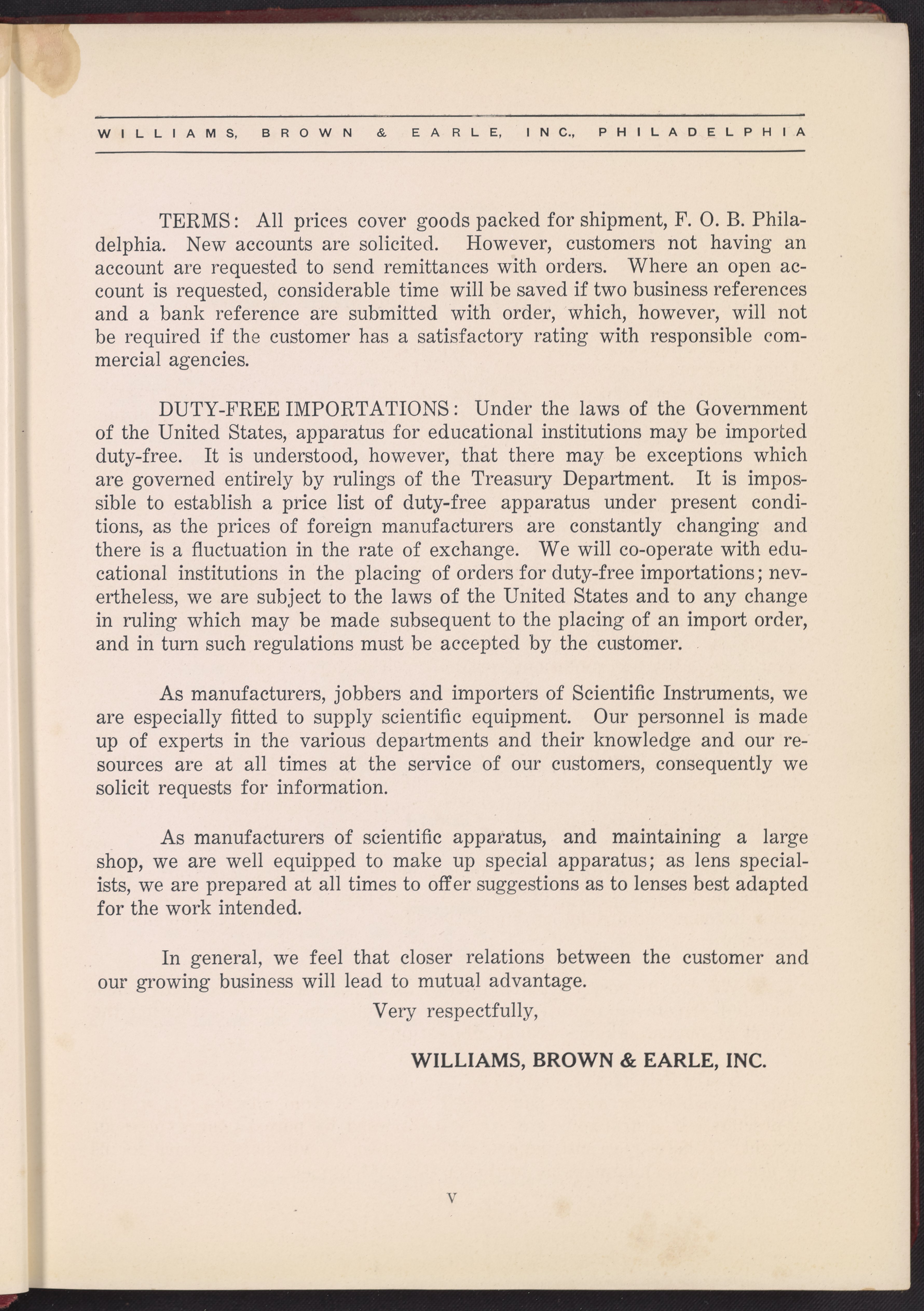Williams, Brown & Earl was an American optical instrument and laboratory supply firm formed by H. S. Williams and N. H. Brown at 918 Chestnut Street, Philadelphia, Pennsylvania. This illustrated catalog includes the description and price of the instrument manufacturer's stock. Digitized content includes 9 illustrations and the work's front matter.