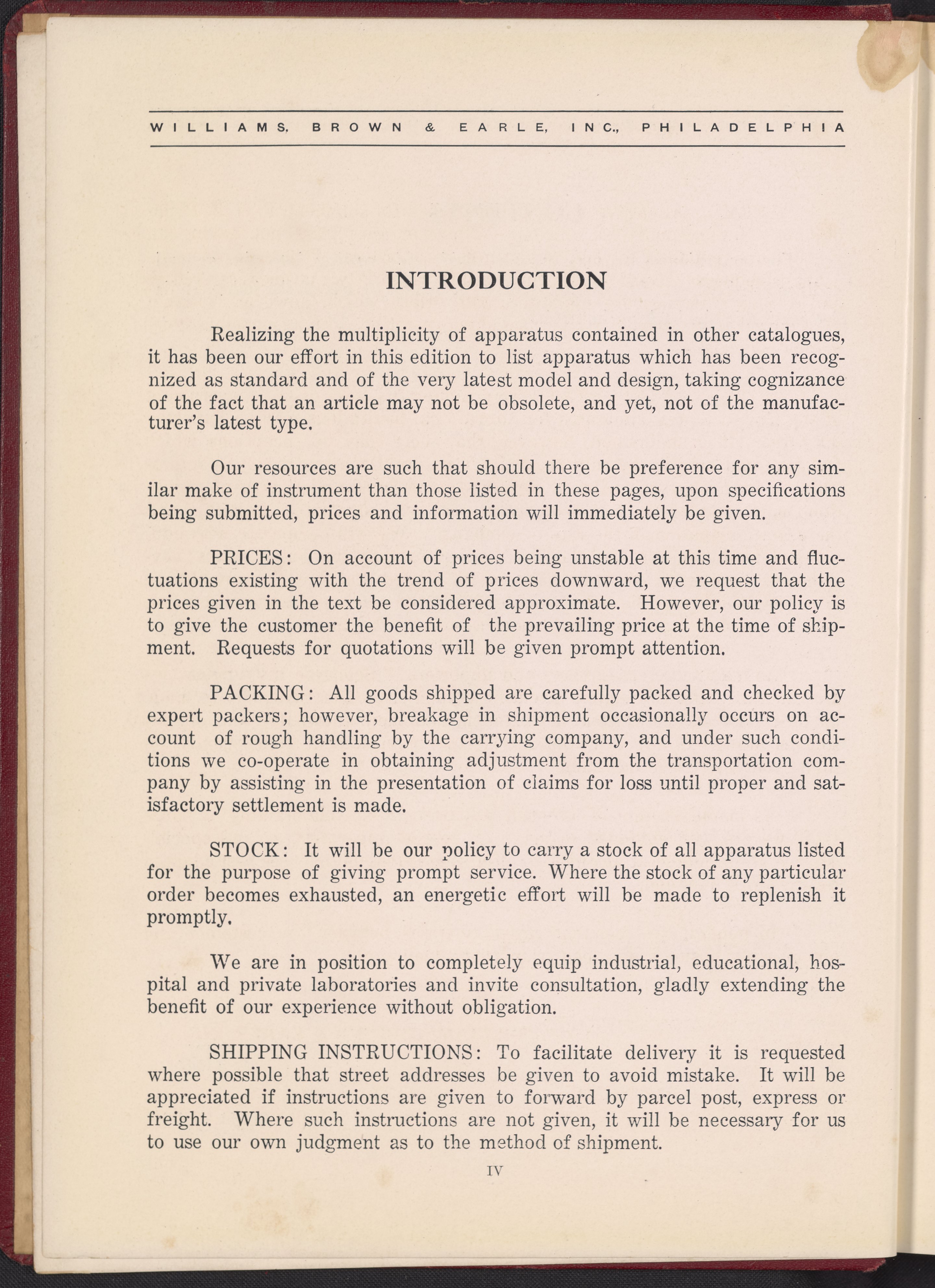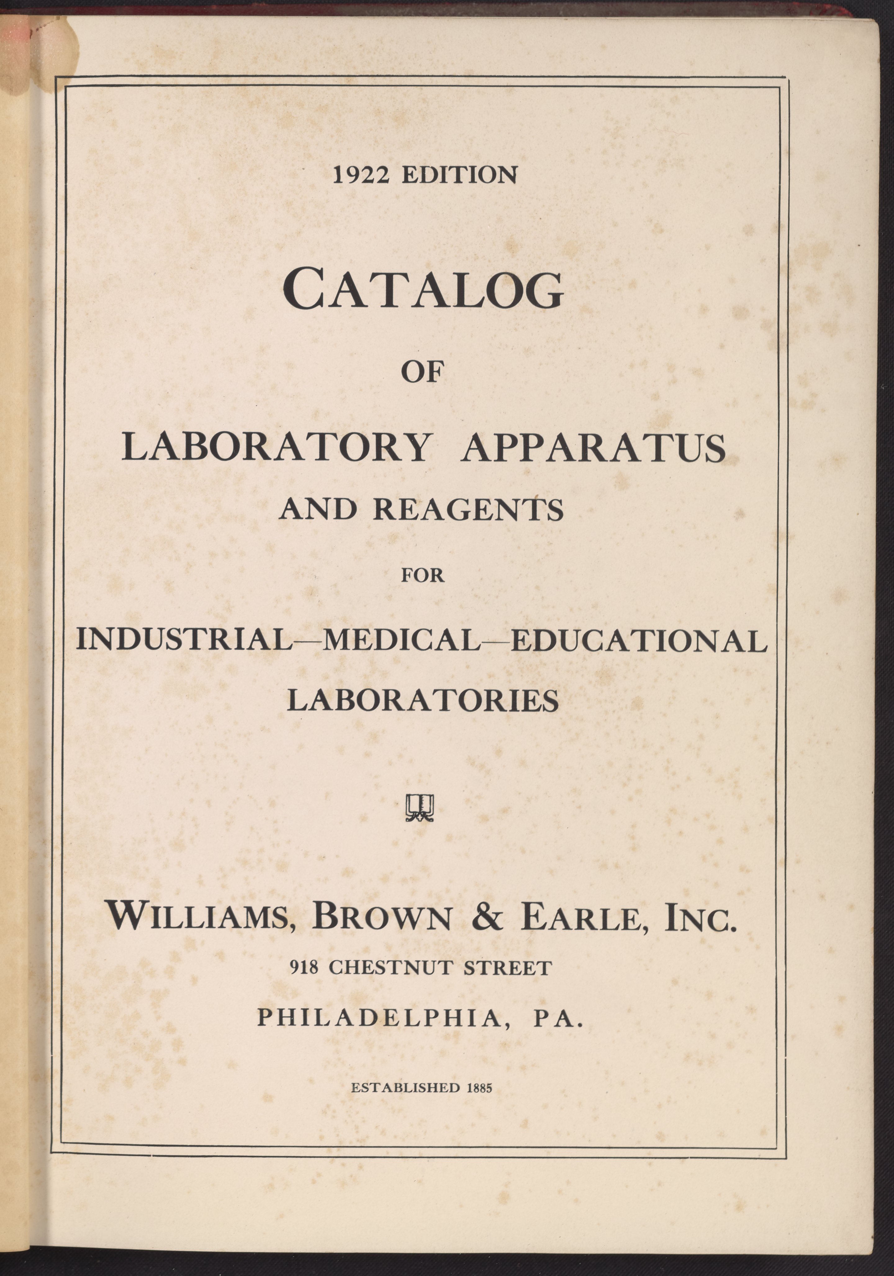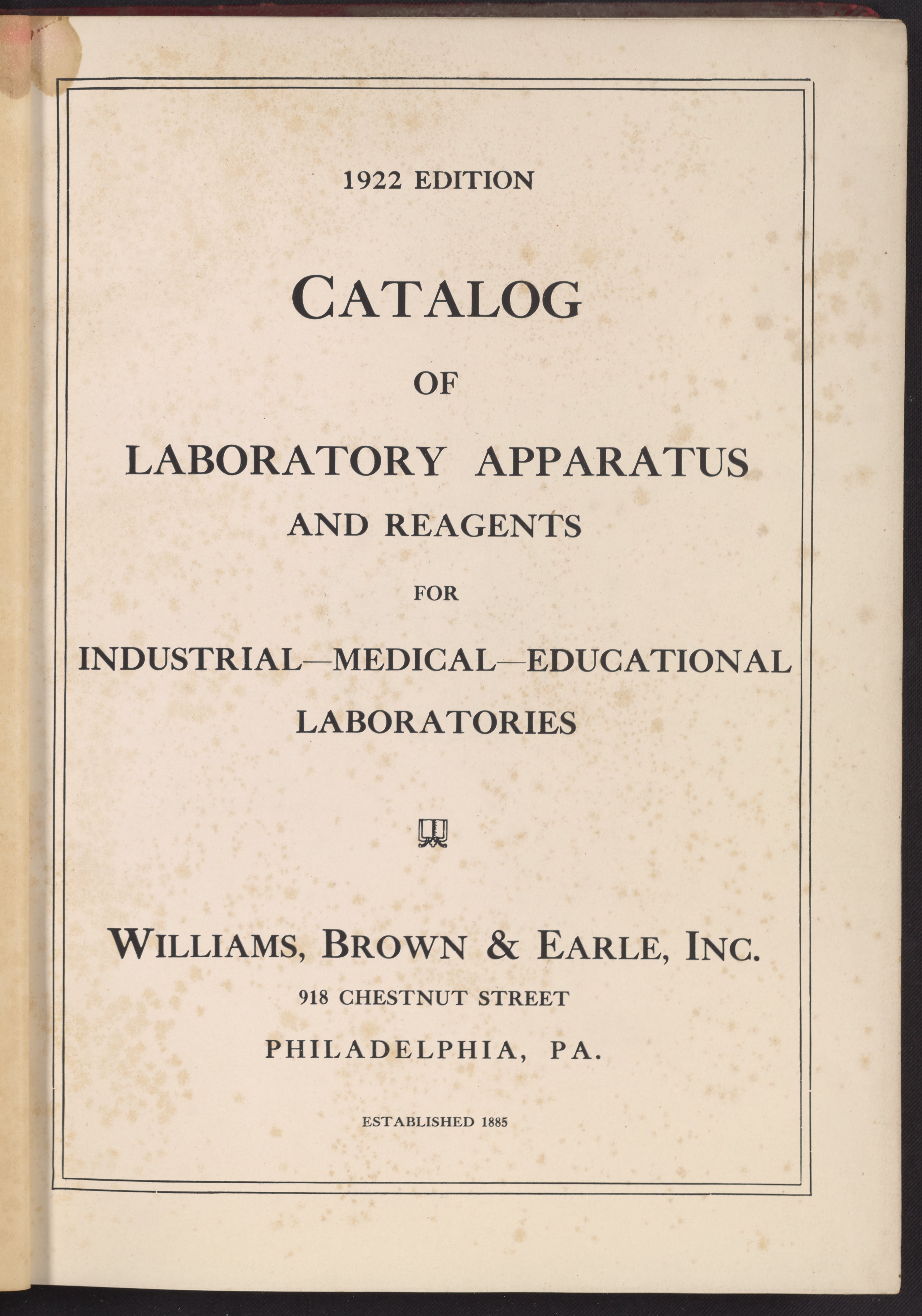 Williams, Brown. “Catalog of Laboratory Apparatus and Reagents for Industrial, Medical, Educational Laboratories.” Philadelphia, Pennsylvania: Brown Williams, 1922. Q185.7 .W55 1922. Science History Institute. Philadelphia. https://digital.sciencehistory.org/works/1jlzom2.