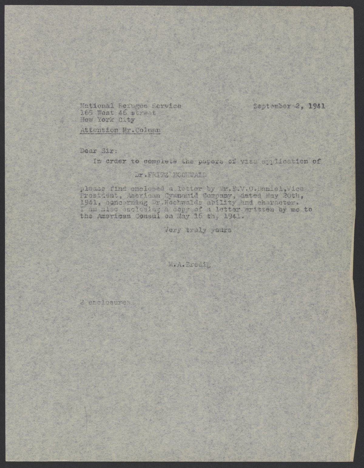 Letter from Max Bredig to Mr. Colman, September 2, 1941