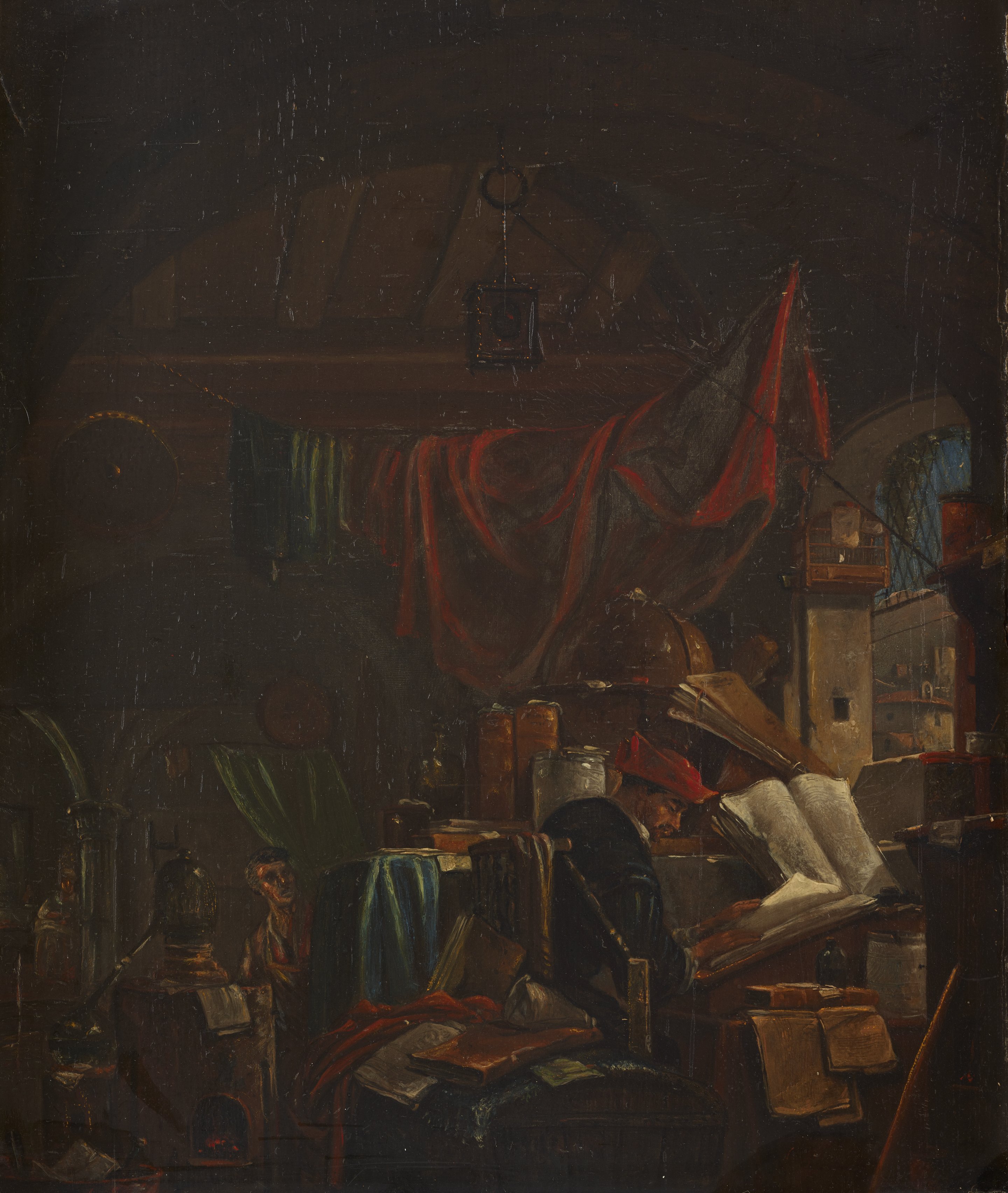 An alchemist reads a large book, seated in a cluttered laboratory with drapery-strewn arched ceilings. The scene is illuminated by the glow of daylight from an open window. His desk is piled high with open texts, folios and notes. In the left foreground an assistant performs a distillation experiment over a portable furnace.