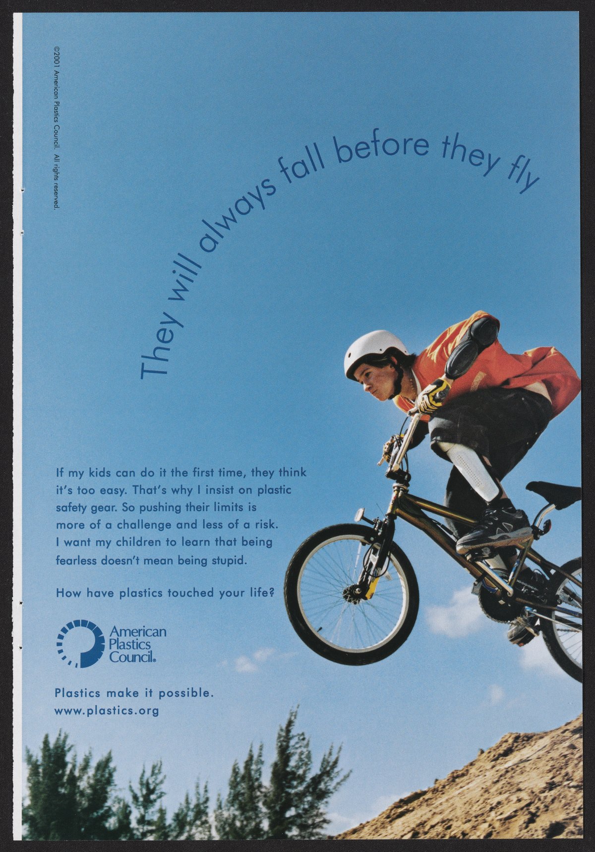 Advertisement by the American Plastics Council, featuring a person riding a mountain bike. The ad praises the use of plastic safety gear and how it can promote safety while still being fearless.