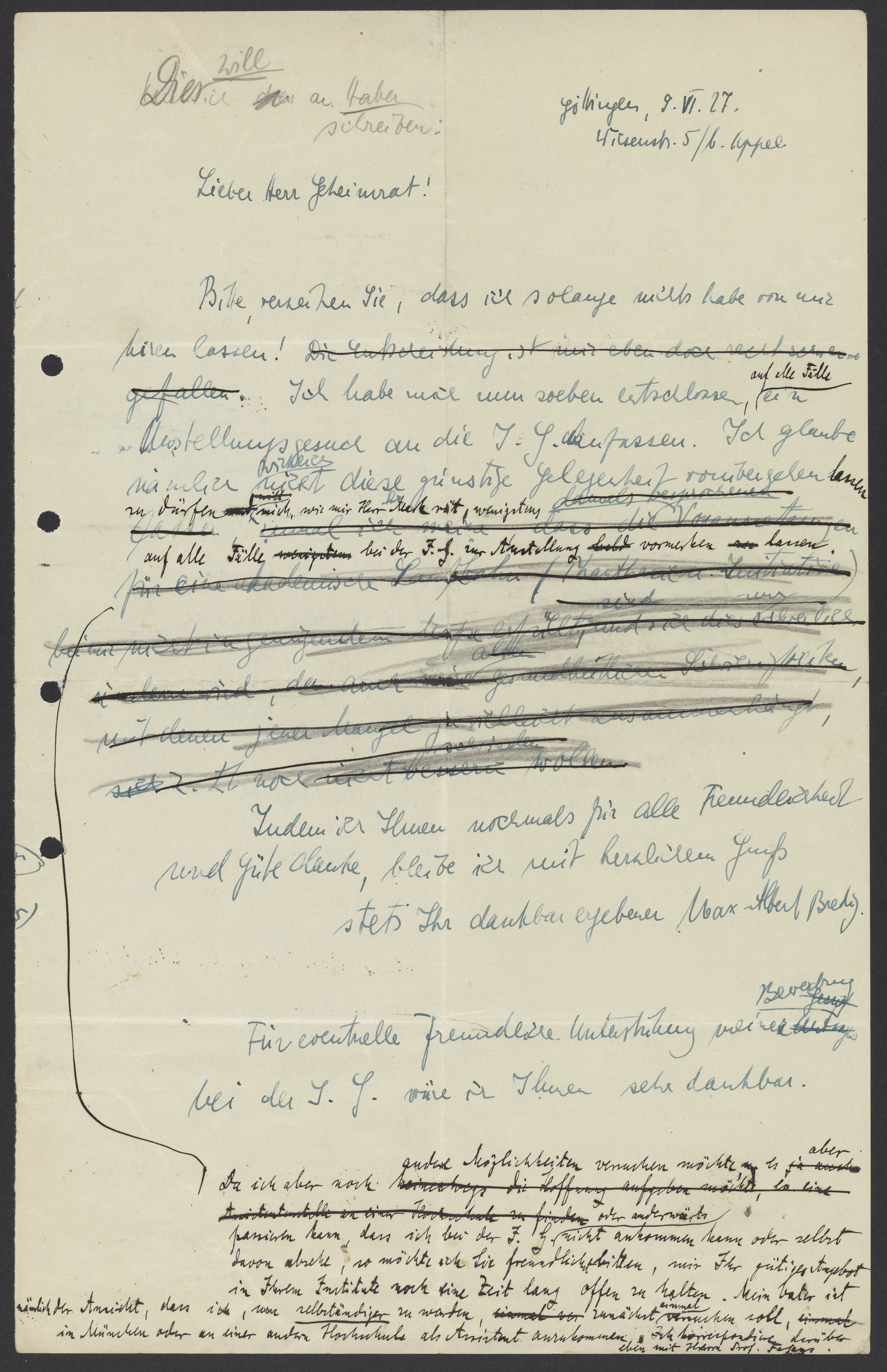 Max Bredig (1902-1977) drafts a letter to Fritz Haber (1868-1934) regarding potential employment in his laboratory.