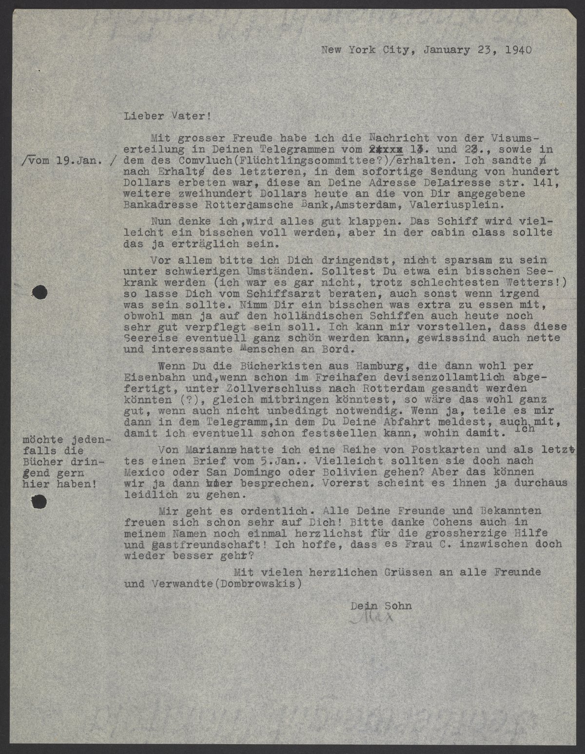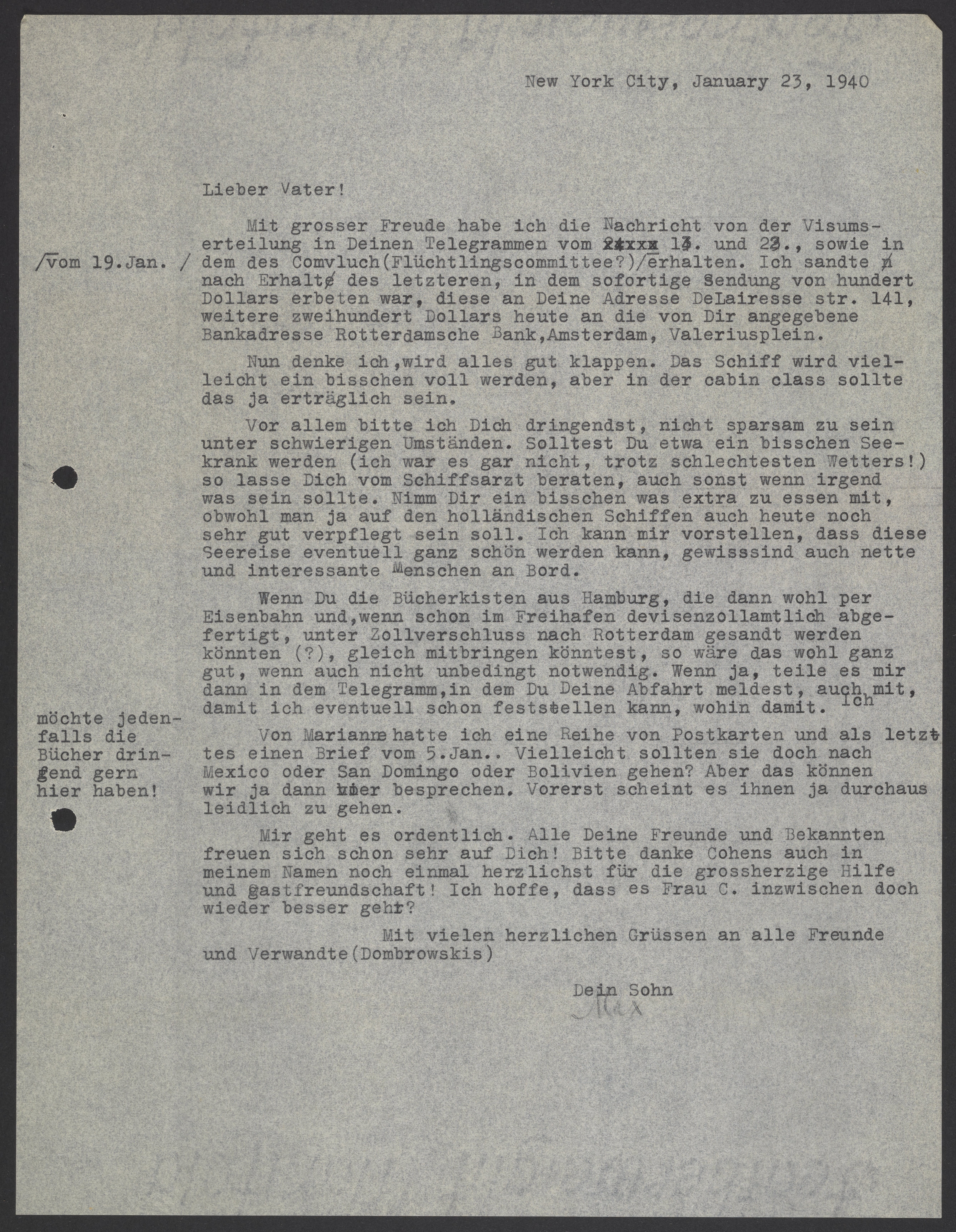 Mit grosser Freude habe ich die Nachricht von der Visumserteilung in Deinen Telegramen vom 19. Jan. und 23., sowie in dem des Comluch (Flüchtlingscomittee?) erhalten. Ich sandte nach Erhalt des letzteren, in dem sofortige Sendung von hundert Dollars erbeten war, diese an Deine Adresse DeLairesse str. 141, weitere zweihundert Dollars heute an die von angegebene Bankadressse Rotterdamsche Bank, Amsterdam, Valeriusplein.