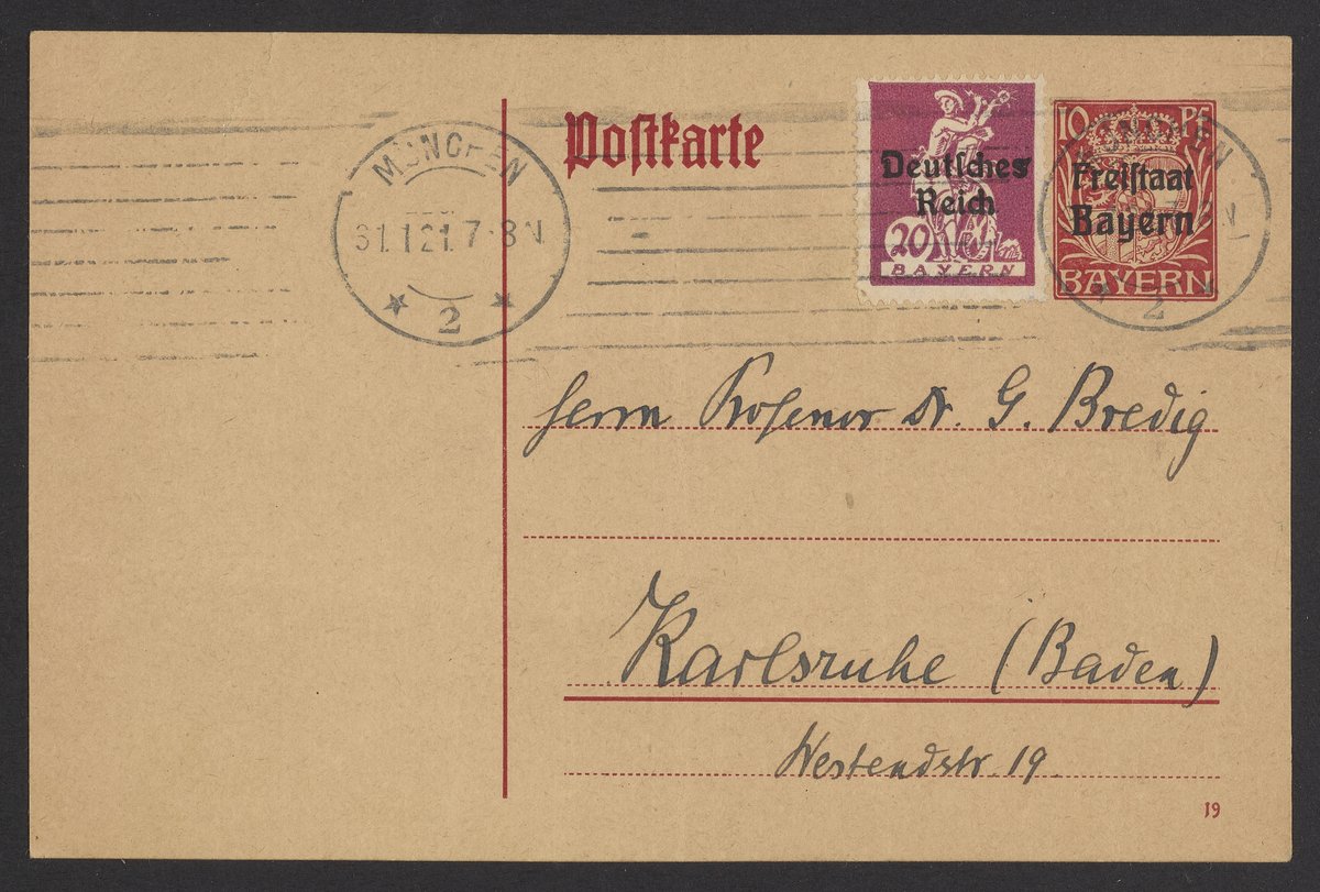 Willstätter, Richard. “Postcard from Richard Willstätter to Georg Bredig, January 1921,” January 30, 1921. Papers of Georg and Max Bredig, Box 2, Folder 28. Science History Institute. Philadelphia. https://digital.sciencehistory.org/works/1quqxwp.