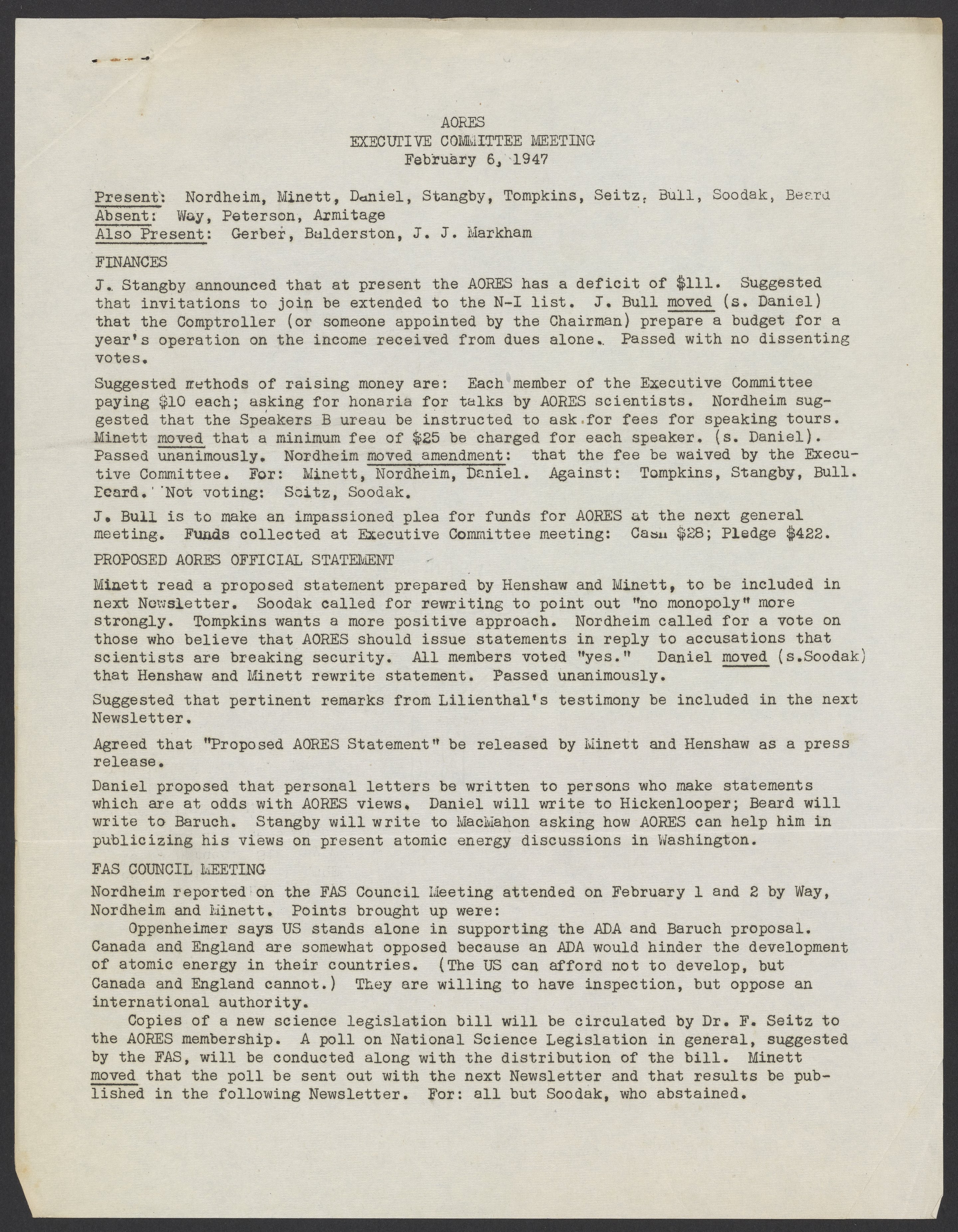 Association of Oak Ridge Engineers and Scientists. “Association of Oak Ridge Engineers and Scientists (AORES) Meeting Minutes, February 6, 1947,” February 6, 1947. Papers of Georg and Max Bredig, Box 10, Folder 4. Science History Institute. Philadelphia. https://digital.sciencehistory.org/works/1tkaxgz.